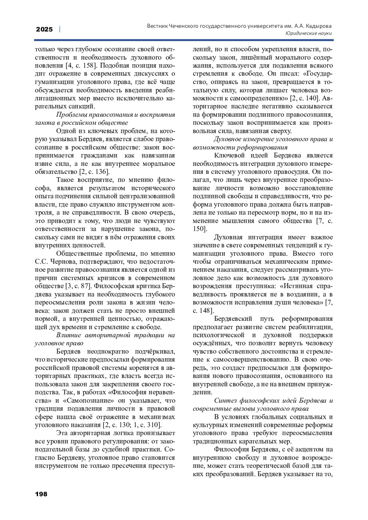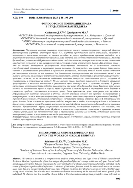 Настоящая статья посвящена комплексному анализу политико-правовых воззрений Николая Александровича Бердяева. Философия права Н. А. Бердяева представляет собой уникальную, глубокую и многогранную концепцию, которая не только выходит за рамки традиционных правовых подходов, но и акцентирует внимание на внутреннем духовном мире человека, его свободе и творческом потенциале. В центре философских размышлений Бердяева находится идея свободы личности, которая понимается им не как внешнее юридическое состояние, а как метафизическая и духовная основа человеческого бытия. Для Бердяева право - это не только инструмент регулирования общественных отношений, но и важнейший механизм, способствующий духовному и моральному росту личности. Он утверждал, что право должно быть тесно связано с христианскими ценностями и духовными принципами, поскольку только такой подход позволяет рассматривать человека не как средство для достижения государственных или коллективных целей, а как высшую ценность, обладающую внутренним достоинством. Бердяев критиковал современные государственно-правовые системы за их склонность подчинять личность интересам коллективного целого, разрушая её уникальность и ограничивая её свободу. По его мнению, право, лишённое морального и духовного измерения, превращается в механизм подавления и утрачивает свою основную цель - служить человеку. В рамках настоящего исследования были подробно рассмотрены ключевые идеи философии права Бердяева, включая его взгляды на соотношение права и морали, права и религии, а также права и государства, идеи Бердяева в контексте проблем современного уголовного права, были предложены пути интеграции его взглядов в реформирование системы наказания в России. Особое внимание уделено его критике тоталитарных и авторитарных систем, которые отрицают духовное начало личности и стремятся ограничить её свободу. В трудах «Самопознание», «Философия неравенства», «О рабстве и свободе человека» философ подчёркивал, что право должно быть основано на принципах свободы, творчества и любви, а не на принуждении и подчинении. Кроме того, в статье проведён анализ актуальности идей Бердяева в современном философском и правовом дискурсе. Привлекаются труды современных исследователей, посвящённые изучению его наследия, что позволяет оценить философию права Бердяева в контексте современных социальных и правовых вызовов. Статья раскрывает как теоретические, так и практические аспекты его подхода, подчёркивая важность интеграции духовных и моральных ценностей в правовую сферу.
