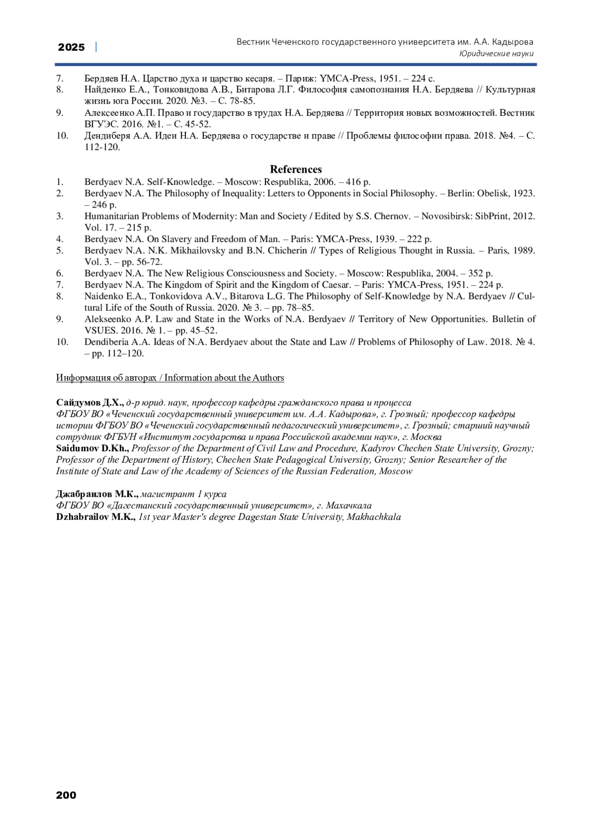 10. Дендиберя А.А. Идеи Н.А. Бердяева о государстве и праве // Проблемы философии права. 2018. №4. - С. 112-120.
