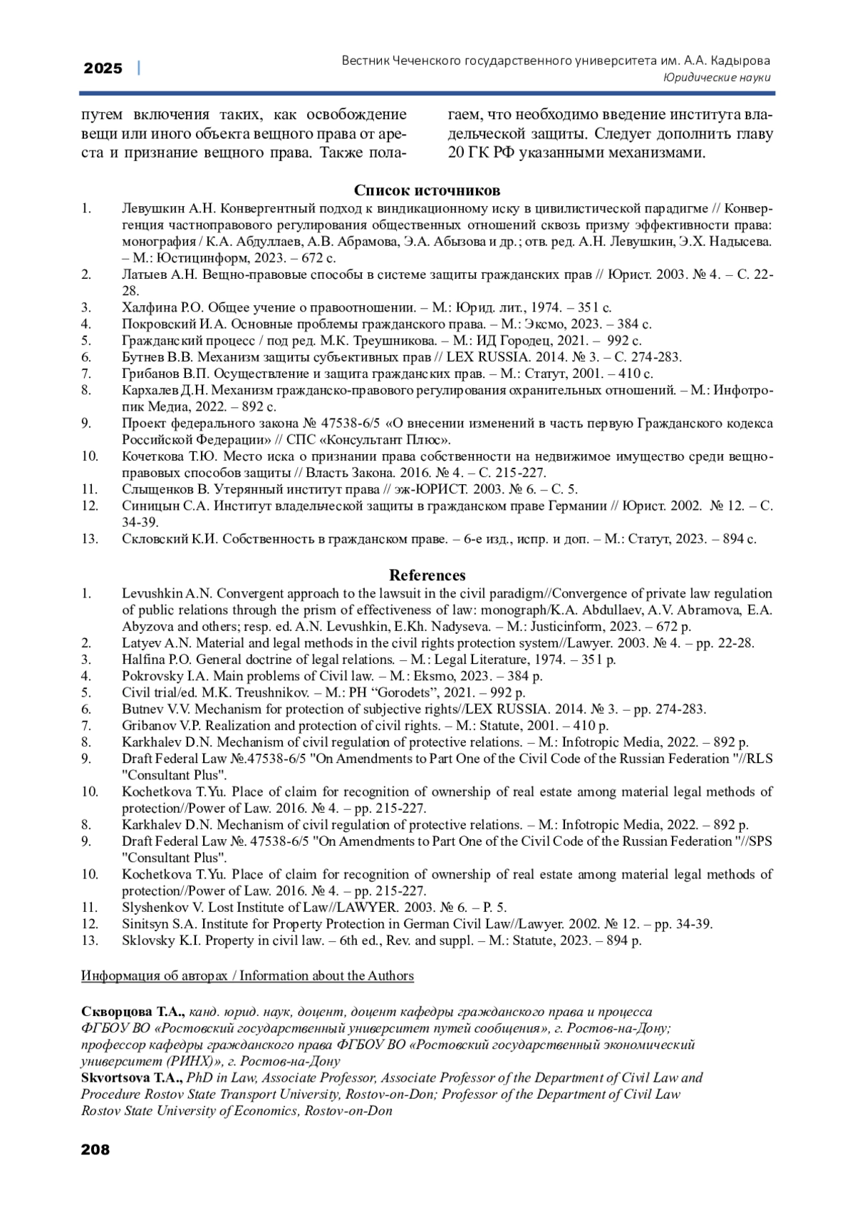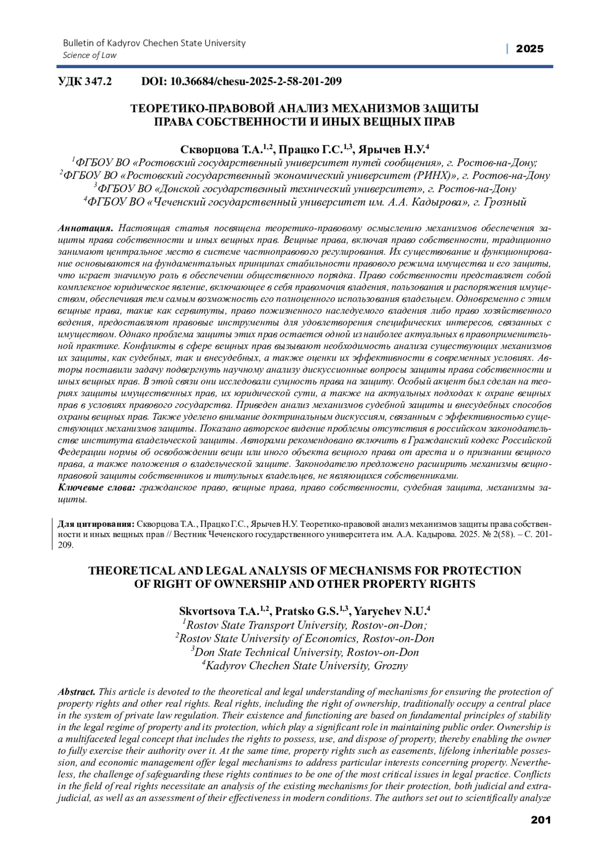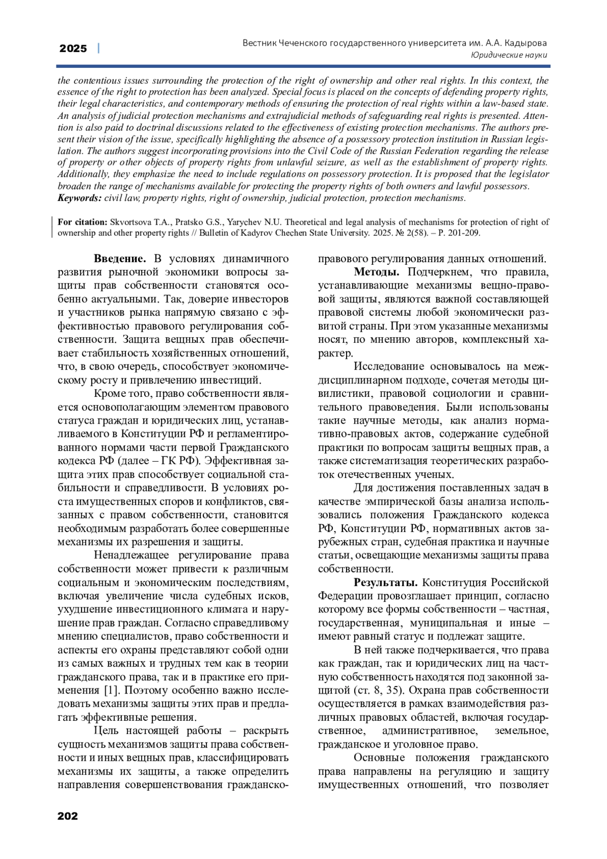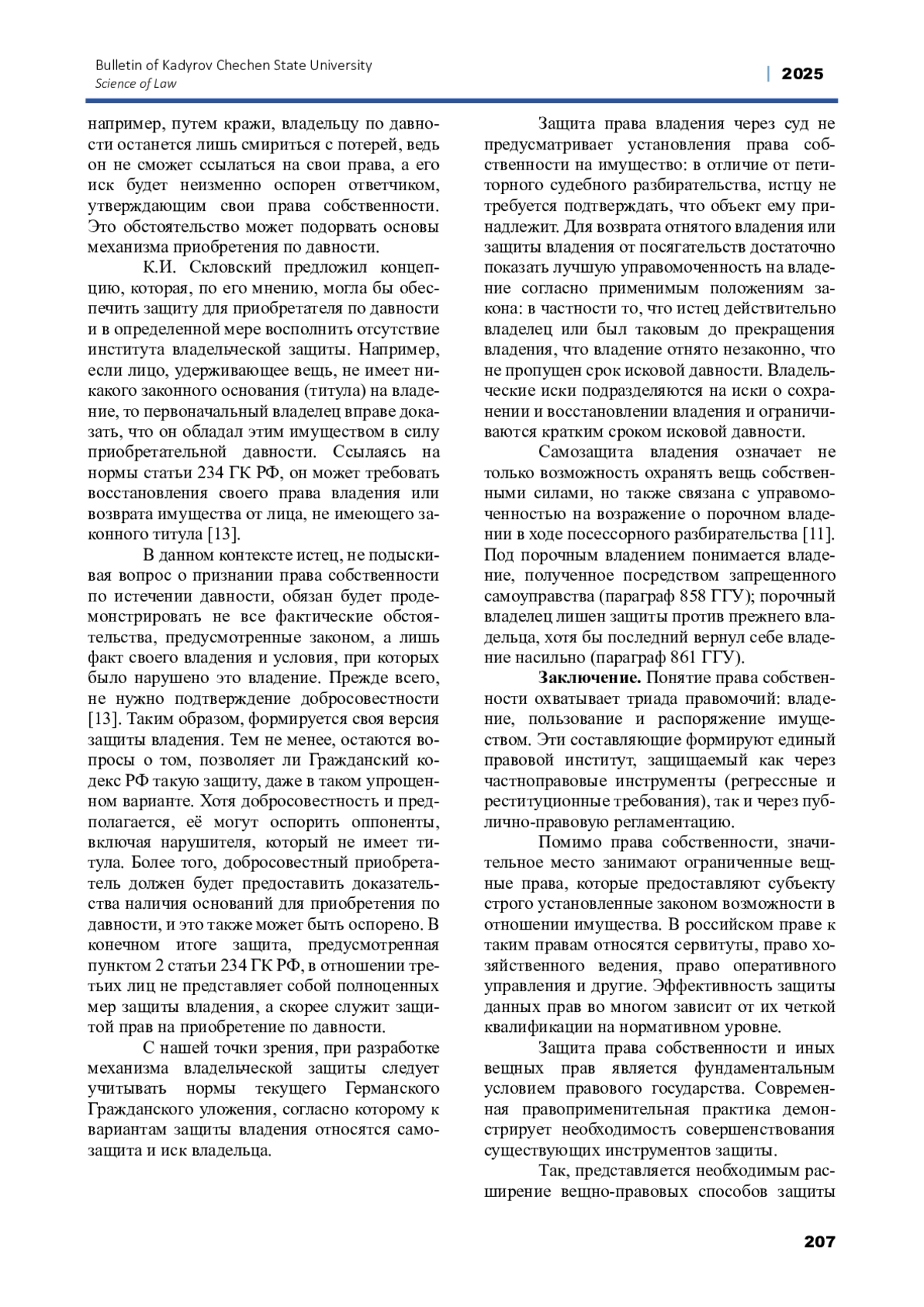 СКВОРЦОВА Т. А., ЯРЫЧЕВ Н. У., СКВОРЦОВА Т. А. ТЕОРЕТИКО-ПРАВОВОЙ АНАЛИЗ МЕХАНИЗМОВ ЗАЩИТЫ ПРАВА СОБСТВЕННОСТИ И ИНЫХ ВЕЩНЫХ ПРАВ // ВЕСТНИК ЧЕЧЕНСКОГО ГОСУДАРСТВЕННОГО УНИВЕРСИТЕТА ИМ. А. А. КАДЫРОВА. 2025. № 2 (58)