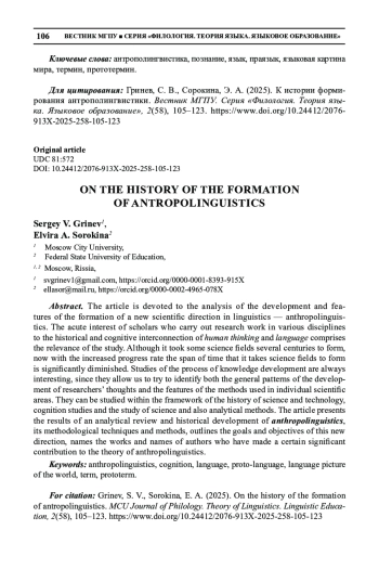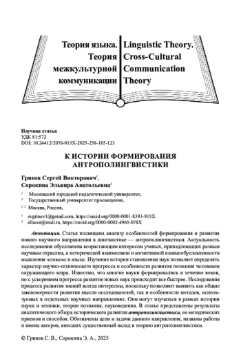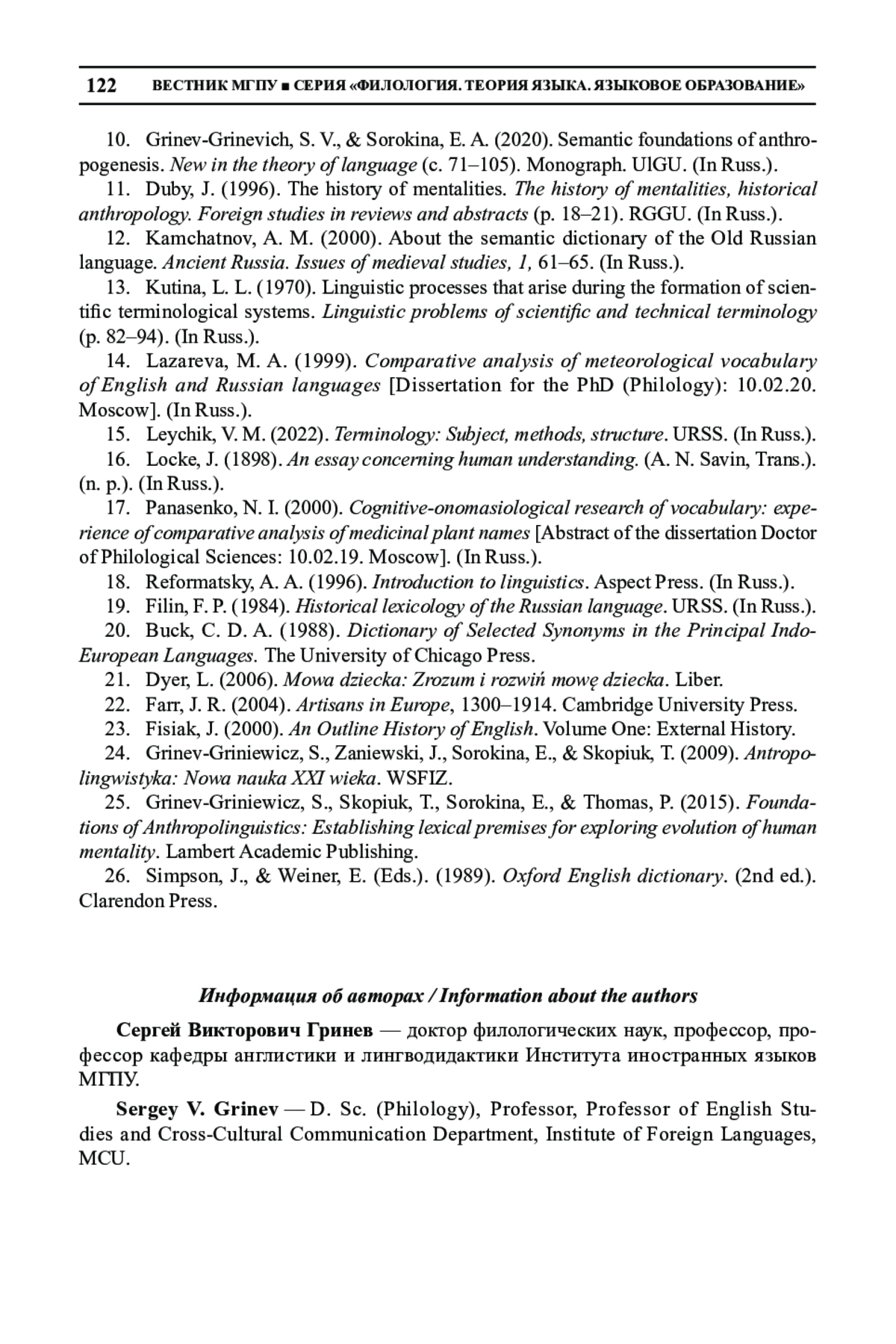 10. Гринев-Гриневич, С. В., & Сорокина, Э. А. (2020). Семантические основы антропогенеза. Новое в теории языка (с. 71-105). Монография. УлГУ.