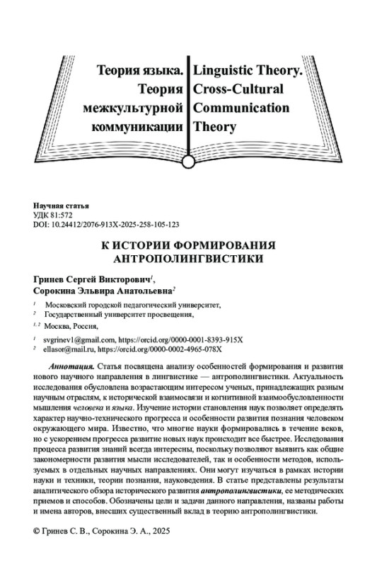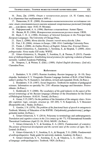 8. Гринев-Гриневич, С. В., Сорокина, Э. А., & Скопюк, Т. Г. (2008). Основы антрополингвистики. Учебное пособие для студентов высших учебных заведений. Академия. EDN: QTXKKL