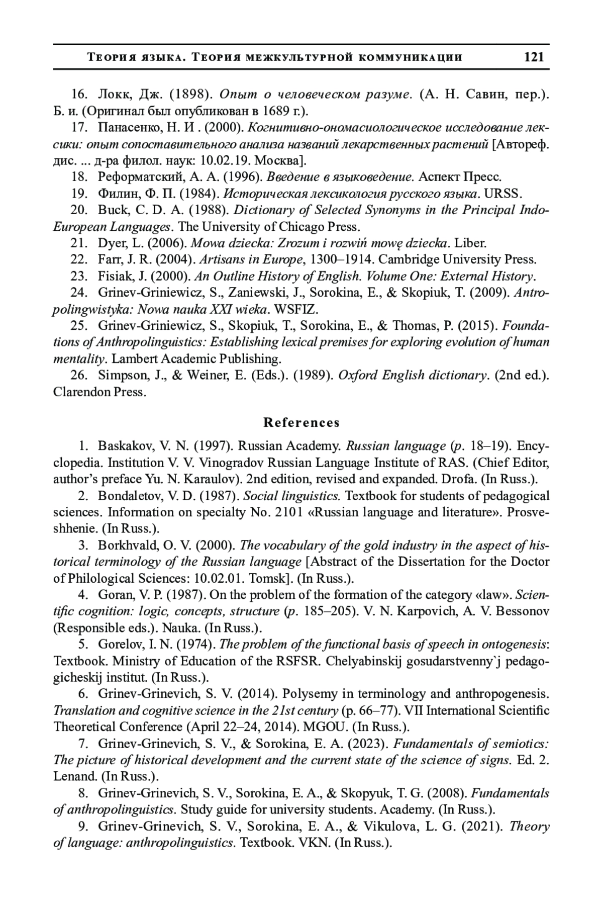 25. Grinev-Griniewicz, S., Skopiuk, T., Sorokina, E., & Thomas, P. (2015). Foundations of Anthropolinguistics: Establishing lexical premises for exploring evolution of human mentality. Lambert Academic Publishing.