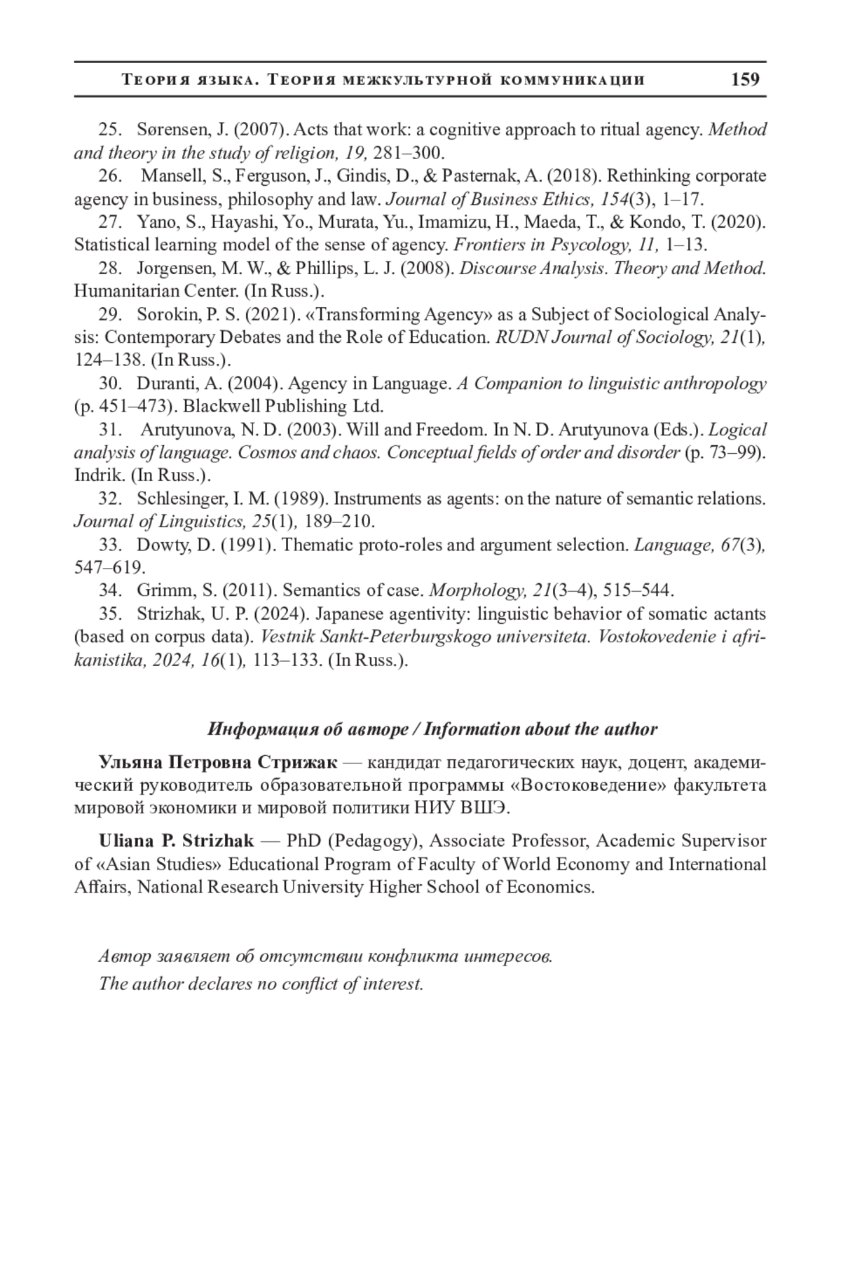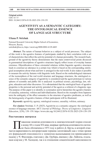 СТРИЖАК У. П. АГЕНТИВНОСТЬ КАК СЕМАНТИЧЕСКАЯ КАТЕГОРИЯ: ОНТОЛОГИЧЕСКАЯ СУЩНОСТЬ ЯЗЫКОВОЙ СТРУКТУРЫ // ВЕСТНИК МГПУ. СЕРИЯ: ФИЛОЛОГИЯ. ТЕОРИЯ ЯЗЫКА. ЯЗЫКОВОЕ ОБРАЗОВАНИЕ. 2025. № 2 (58)