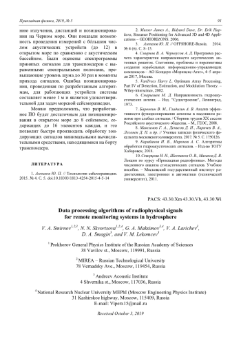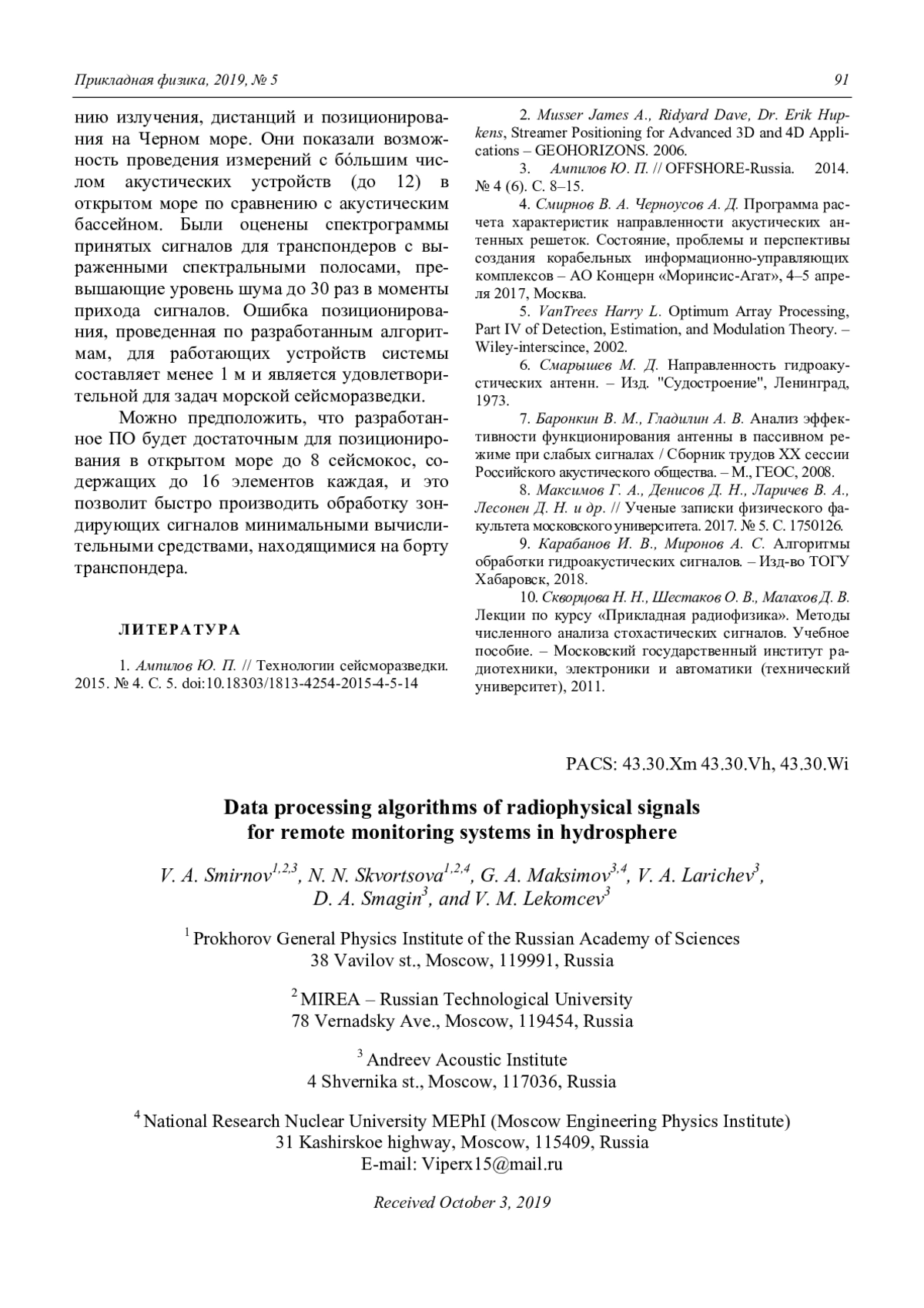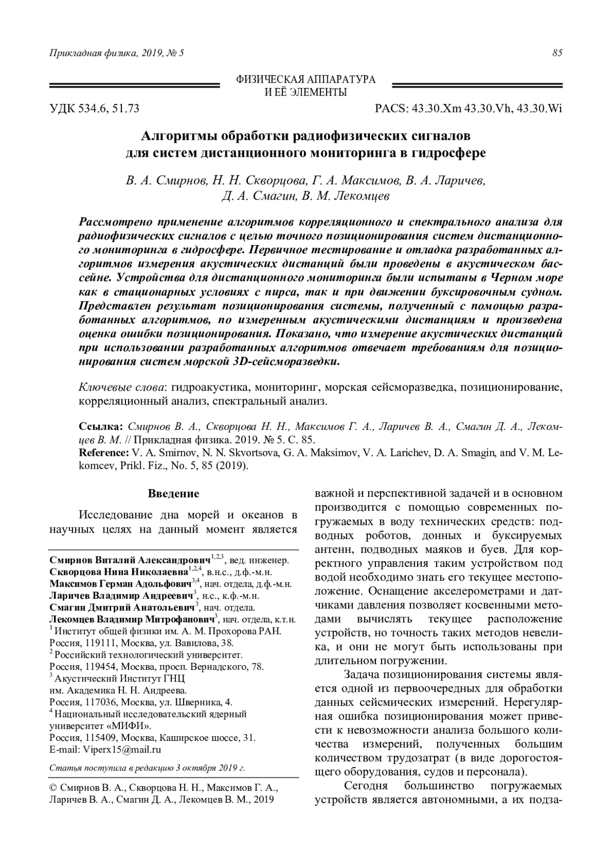 СМИРНОВ В. А., СКВОРЦОВА Н. Н., МАКСИМОВ Г. А., ЛАРИЧЕВ В. А., СМАГИН Д. А., ЛЕКОМЦЕВ В. М. АЛГОРИТМЫ ОБРАБОТКИ РАДИОФИЗИЧЕСКИХ СИГНАЛОВ ДЛЯ СИСТЕМ ДИСТАНЦИОННОГО МОНИТОРИНГА В ГИДРОСФЕРЕ // ПРИКЛАДНАЯ ФИЗИКА. 2019. №5