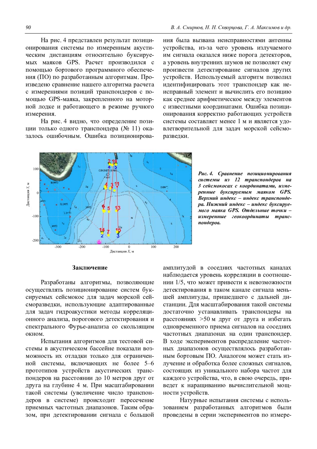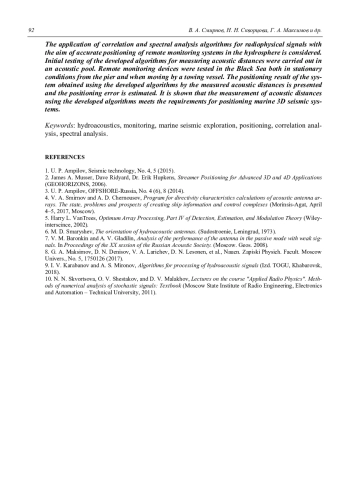 Рассмотрено применение алгоритмов корреляционного и спектрального анализа для радиофизических сигналов с целью точного позиционирования систем дистанционного мониторинга в гидросфере. Первичное тестирование и отладка разработанных алгоритмов измерения акустических дистанций были проведены в акустическом бассейне. Устройства для дистанционного мониторинга были испытаны в Черном море как в стационарных условиях с пирса, так и при движении буксировочным судном. Представлен результат позиционирования системы, полученный с помощью разработанных алгоритмов, по измеренным акустическими дистанциям и произведена оценка ошибки позиционирования. Показано, что измерение акустических дистанций при использовании разработанных алгоритмов отвечает требованиям для позиционирования систем морской 3D-сейсморазведки.