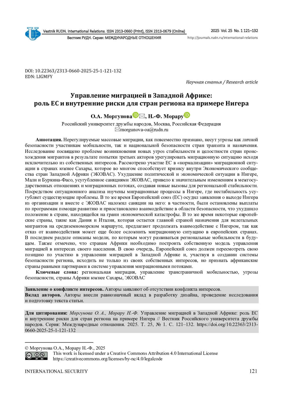 Нерегулируемые массовые миграции, как повсеместно признано, несут угрозы как личной безопасности участникам мобильности, так и национальной безопасности стран транзита и назначения. Исследование посвящено проблеме возникновения новых угроз стабильности и целостности стран происхождения мигрантов в результате попытки третьих акторов урегулировать миграционную ситуацию исходя исключительно из собственных интересов. Рассмотрено участие ЕС в «нормализации» миграционной ситуации в странах южнее Сахары, которое во многом способствует кризису внутри Экономического сообщества стран Западной Африки (ЭКОВАС). Ухудшение политической и экономической ситуации в Нигере, Мали и Буркина-Фасо, усугубленное санкциями ЭКОВАС, привело к значительным изменениям в межгосударственных отношениях и миграционных потоках, создавая новые вызовы для региональной стабильности. Посредством ситуационного анализа изучены миграционные процессы в Нигере, где нестабильность усугубляет существующие проблемы. В то же время Европейский союз (ЕС) осудил заявления о выходе Нигера из организации и вместе с ЭКОВАС наложил санкции на него: в частности, были остановлены выплаты по программам помощи развитию и приостановлено взаимодействие в области безопасности, что ухудшило положение в стране, находящейся на грани экономической катастрофы. В то же время некоторые европейские страны, такие как Дания и Италия, которая остается главной страной назначения для нелегальных мигрантов на средиземноморском маршруте, предлагают продолжать взаимодействие с Нигером, так как отказ от взаимодействия может еще более осложнить миграционную ситуацию в европейских странах. В последнем разделе описаны модели, по которым могут развиваться региональные мобильности в будущем. Также отмечено, что странам Африки необходимо построить собственную модель управления миграцией в интересах своего населения. В свою очередь, Европейский союз должен пересмотреть свою позицию по участию в управлении миграцией в Западной Африке и, участвуя в создании системы безопасности региона, исходить не только из своих собственных интересов, но признать африканские страны равными партнерами в системе управления миграционными потоками.