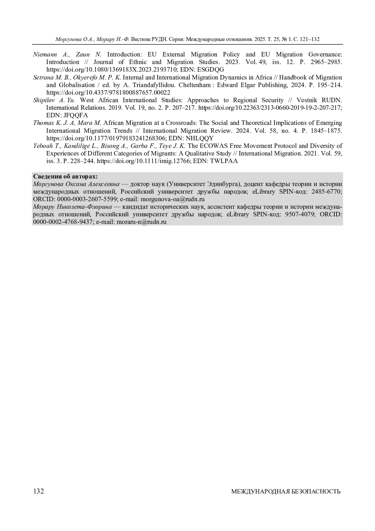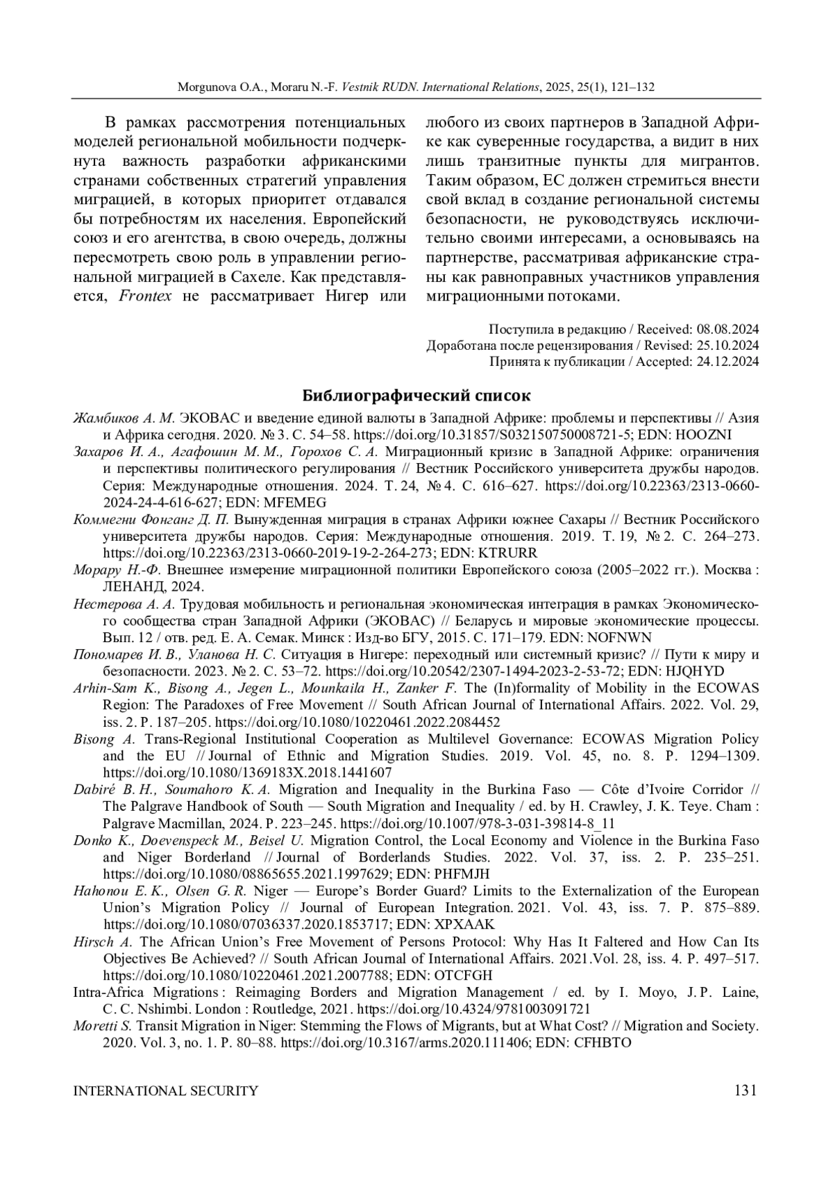 2. Захаров И. А., Агафошин М. М., Горохов С. А. Миграционный кризис в Западной Африке: ограничения и перспективы политического регулирования // Вестник Российского университета дружбы народов. Серия: Международные отношения. 2024. Т. 24, № 4. C. 616-627. ;. DOI: 10.22363/2313-0660-2024-24-4-616-627 EDN: MFEMEG