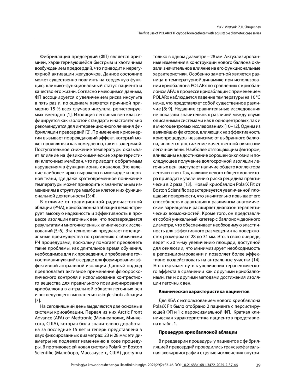 Цель. Представить первый клинический опыт применения криобаллонного катетера с регулируемым диаметром POLARx FIT для криобаллонной аблации (КБА) у пациентов с фибрилляцией предсердий (ФП) в Российской Федерации.