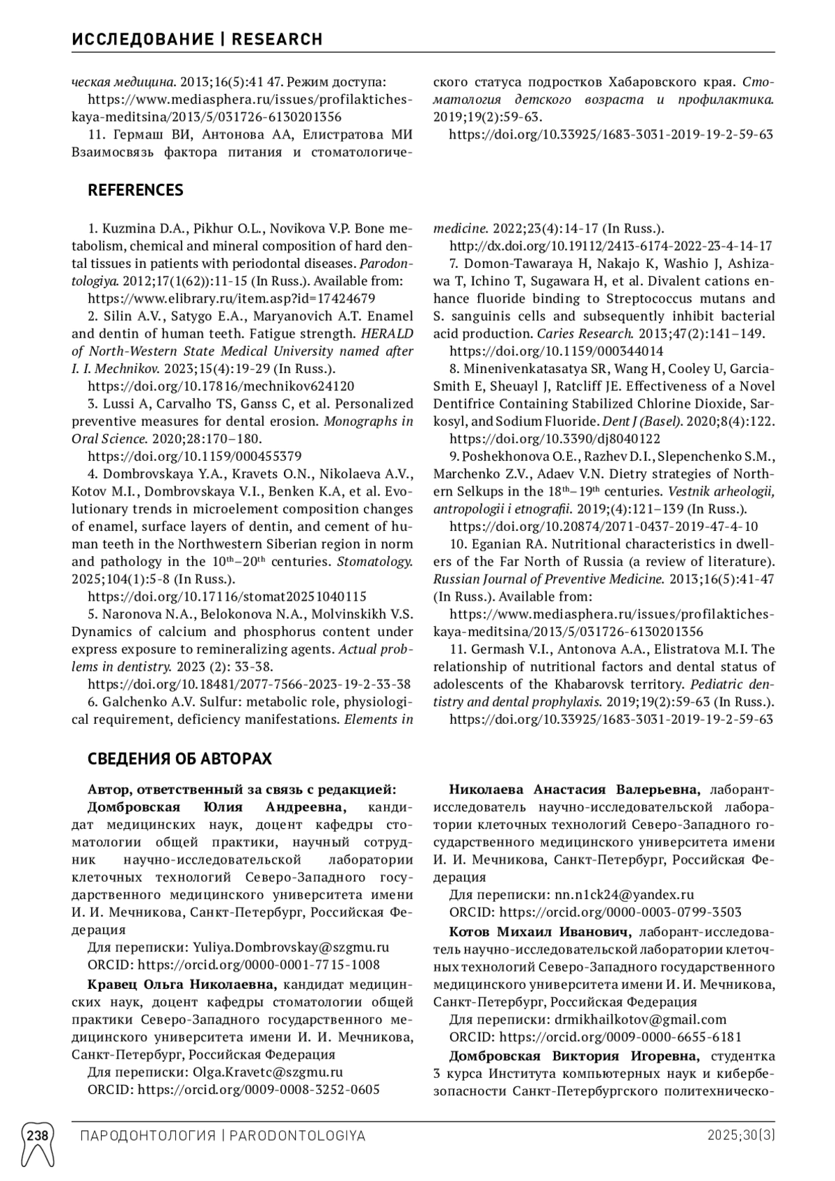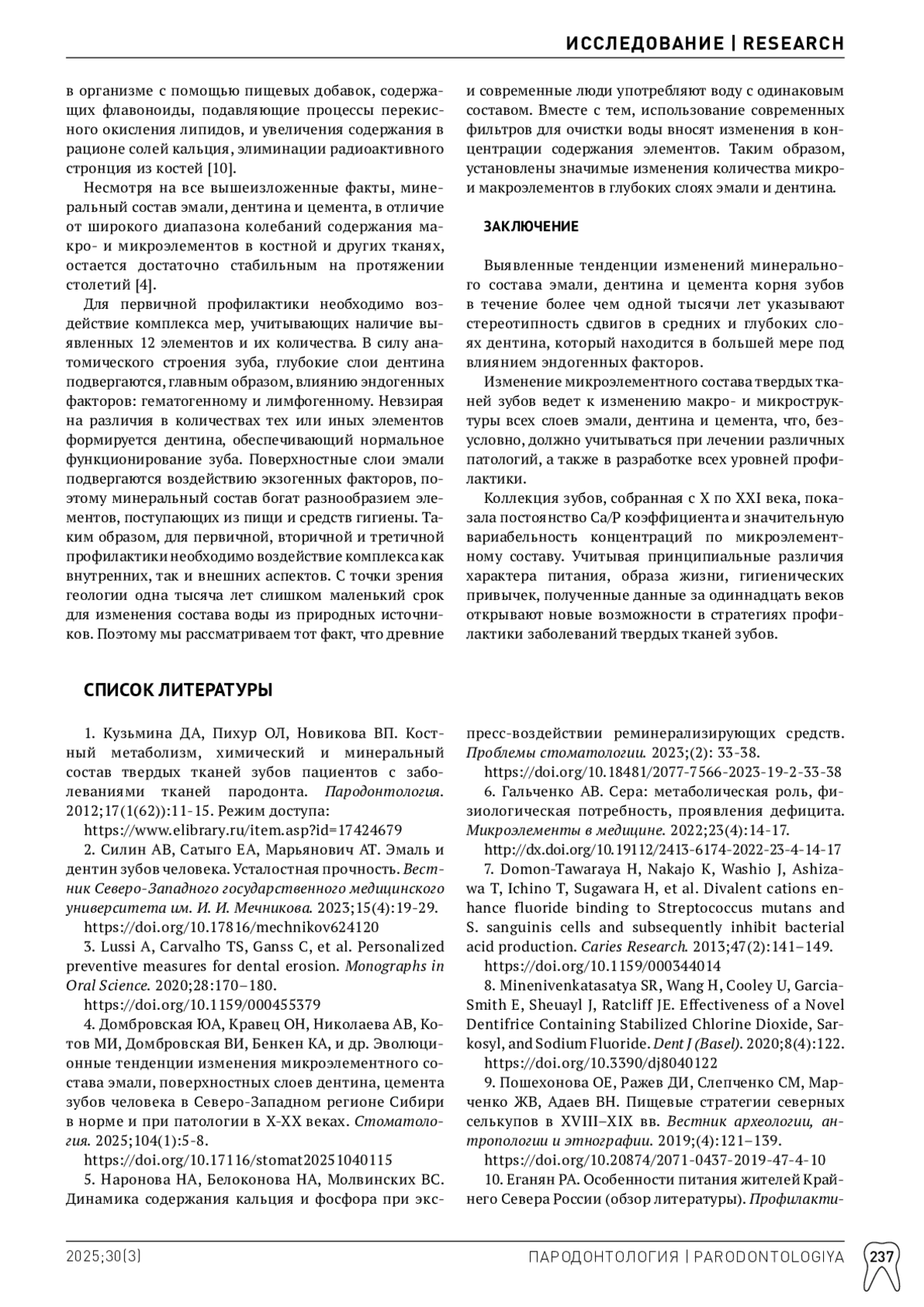 4. Домбровская ЮА, Кравец ОН, Николаева АВ, Котов МИ, Домбровская ВИ, Бенкен КА, и др. Эволюционные тенденции изменения микроэлементного состава эмали, поверхностных слоев дентина, цемента зубов человека в Северо-Западном регионе Сибири в норме и при патологии в X-XX веках. Стоматология. 2025;104(1):5-8. DOI: 10.17116/stomat20251040115