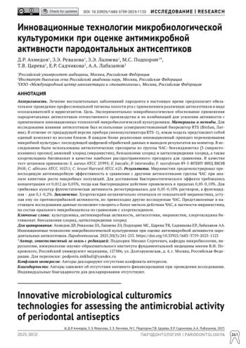 Актуальность. Лечение воспалительных заболеваний пародонта в настоящее время предполагает обязательное проведение профессиональной гигиены полости рта с применением различных антисептиков в виде ополаскивателей и ирригатантов. Цель. Экспериментально-микробиологическое обоснование применения пародонтальных антисептиков отечественного производства и их комбинаций для усиления активности с применением инновационных технологий микробиологической культуромики. Материалы и методы. Для исследования влияния антисептиков был использован усовершенствованный биореактор RTS (BioSan, Латвия). В отличие от предыдущей версии прибора (монокультиватора RTS-1), новая модель представляет собой единый комплект из восьми блоков. В каждом блоке реализован инновационный принцип перемешивания микробной культуры с последующей цифровой обработкой данных и выводом результатов на монитор. В исследовании были использованы антисептические препараты из группы ЧАС: бензилдиметил [3-(миристоиламино) пропил] аммоний хлорид (мирамистин), бензалкония хлорид и цитилпиридиния хлорид, а также хлоргексидина биглюконат в качестве наиболее распространенного препарата для сравнения. В качестве тест-штаммов применяли: S. aureus АТСС 25993; E. faecalis; P. intermedia; F. necroforum 89-5 ФГБНУ ФНЦ ВИЭВ РАН; C. albicans АТСС 10231; C. krusei Harvard ATCC 625. Результаты. Мирамистин продемонстрировал превосходящую антимикробную эффективность в сравнении с другими антисептиками группы ЧАС при анализе кинетики роста микробных популяций. Для достижения бактериостатического эффекта требовались концентрации от 0,012 до 0,05%, тогда как бактерицидное действие проявлялось в пределах 0,05-0,10%. Для грибковых культур фунгистатическая активность регистрировалась для 0,05-0,10% растворов, а фунгицидная – для 0,1-0,2%. Заключение. Хлоргексидин незначительно отличался от показателей мирамистина, уступая ему по противогрибковой активности, но превосходил другие исследуемые ЧАС. Представленные в настоящем исследовании данные позволяют говорить о более мягком действии ЧАС, в частности мирамистина, на состав орального микробиоценоза по сравнению с х лоргексидином.
