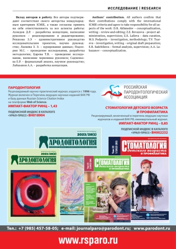 22. Царева ТВ, Балмасова ИП, Царев ВН. Поддесневой микробиом при заболеваниях пародонта и коморбидной патологии (метаанализ). Журнал микробиологии, эпидемиологии и иммунобиологии. 2024;101(2):281-292. DOI: 10.36233/0372-9311-500