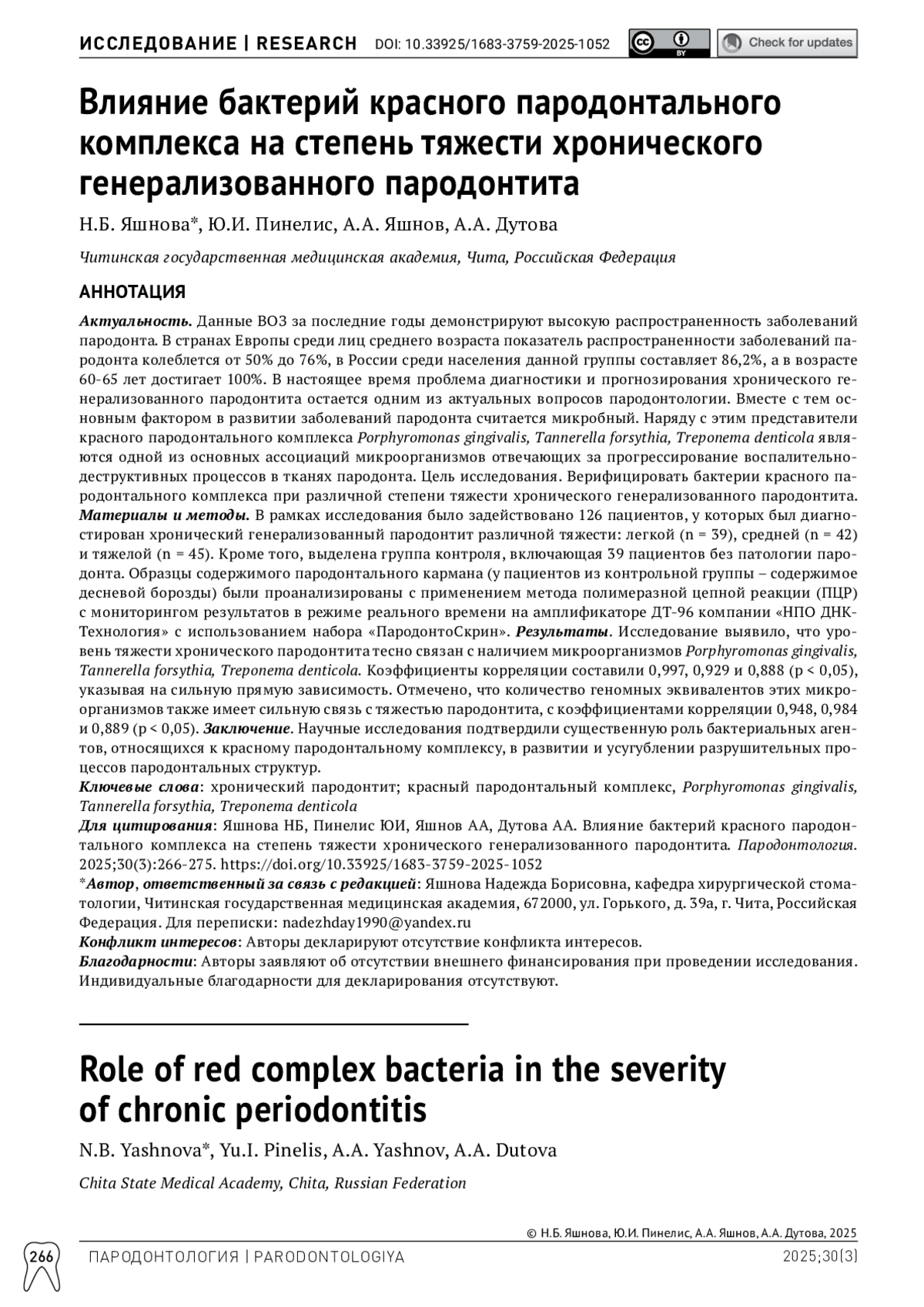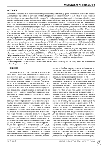 Актуальность. Данные ВОЗ за последние годы демонстрируют высокую распространенность заболеваний пародонта. В странах Европы среди лиц среднего возраста показатель распространенности заболеваний пародонта колеблется от 50% до 76%, в России среди населения данной группы составляет 86,2%, а в возрасте 60-65 лет достигает 100%. В настоящее время проблема диагностики и прогнозирования хронического генерализованного пародонтита остается одним из актуальных вопросов пародонтологии. Вместе с тем основным фактором в развитии заболеваний пародонта считается микробный. Наряду с этим представители красного пародонтального комплекса Porphyromonas gingivalis, Tannerella forsythia, Treponema denticola являются одной из основных ассоциаций микроорганизмов отвечающих за прогрессирование воспалительнодеструктивных процессов в тканях пародонта. Цель исследования. Верифицировать бактерии красного пародонтального комплекса при различной степени тяжести хронического генерализованного пародонтита. Материалы и методы. В рамках исследования было задействовано 126 пациентов, у которых был диагностирован хронический генерализованный пародонтит различной тяжести: легкой (n = 39), средней (n = 42) и тяжелой (n = 45). Кроме того, выделена группа контроля, включающая 39 пациентов без патологии пародонта. Образцы содержимого пародонтального кармана (у пациентов из контрольной группы – содержимое десневой борозды) были проанализированы с применением метода полимеразной цепной реакции (ПЦР) с мониторингом результатов в режиме реального времени на амплификаторе ДТ-96 компании «НПО ДНКТехнология» с использованием набора «ПародонтоСкрин». Результаты. Исследование выявило, что уровень тяжести хронического пародонтита тесно связан с наличием микроорганизмов Porphyromonas gingivalis, Tannerella forsythia, Treponema denticola. Коэффициенты корреляции составили 0,997, 0,929 и 0,888 (p < 0,05), указывая на сильную прямую зависимость. Отмечено, что количество геномных эквивалентов этих микроорганизмов также имеет сильную связь с тяжестью пародонтита, с коэффициентами корреляции 0,948, 0,984 и 0,889 (p < 0,05). Заключение. Научные исследования подтвердили существенную роль бактериальных агентов, относящихся к красному пародонтальному комплексу, в развитии и усугублении разрушительных процессов пародонтальных структур.