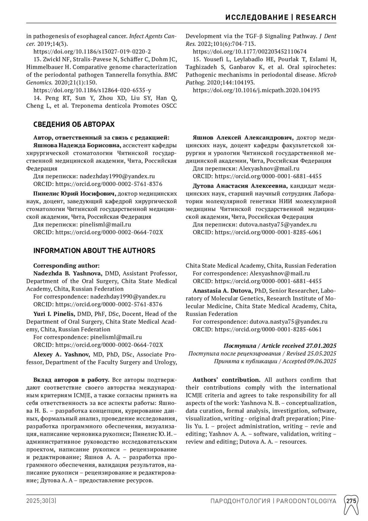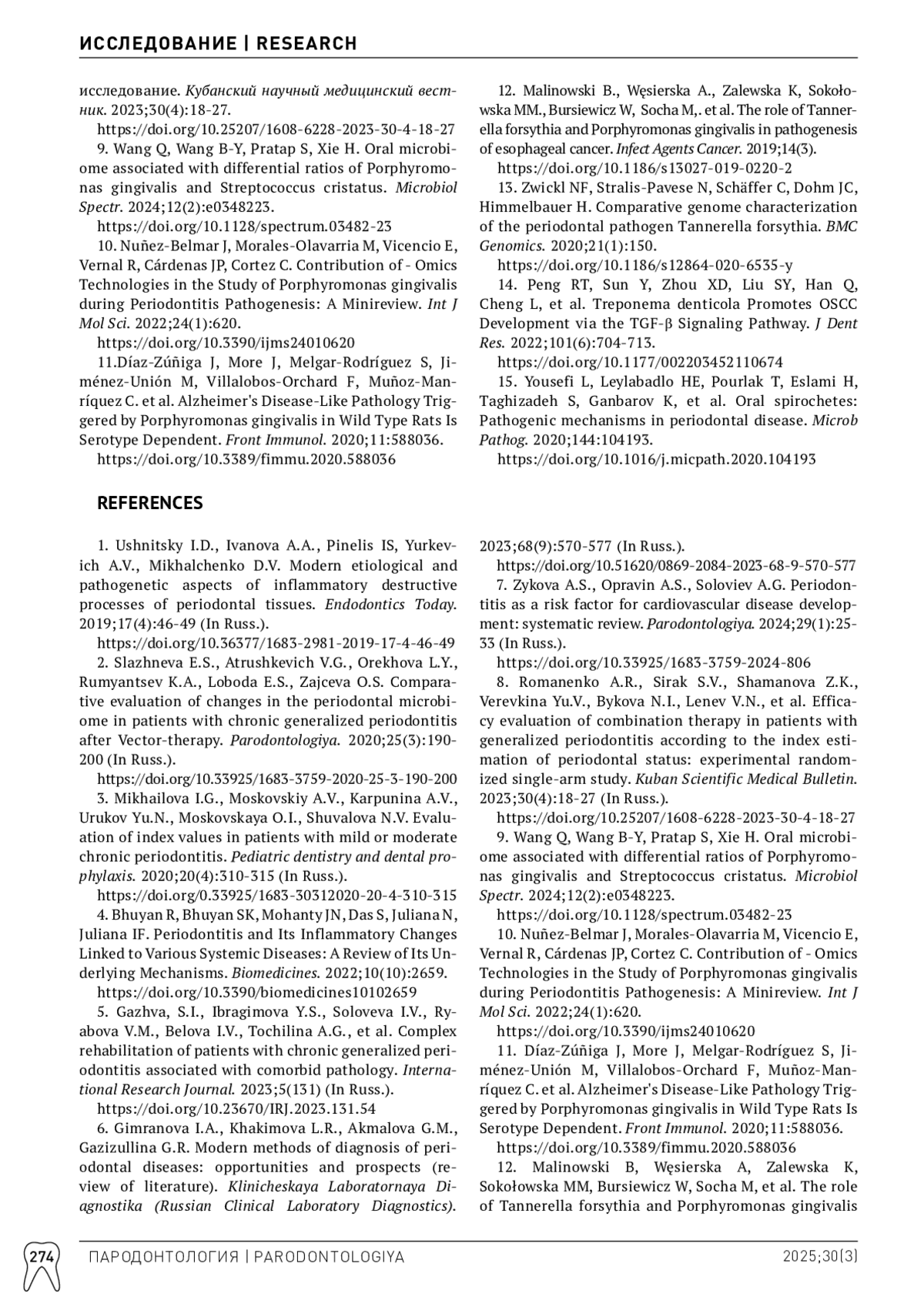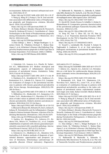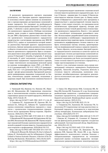 1. Ушницкий ИД, Иванова АА, Пинелис ИС, Юркевич АВ, Михальченко ДВ. Современные этиологические и патогенетические аспекты воспалительно-деструктивных процессов тканей пародонта. Эндодонтия Today. 2019;17(4):46-49. DOI: 10.36377/1683-2981-2019-17-4-46-49