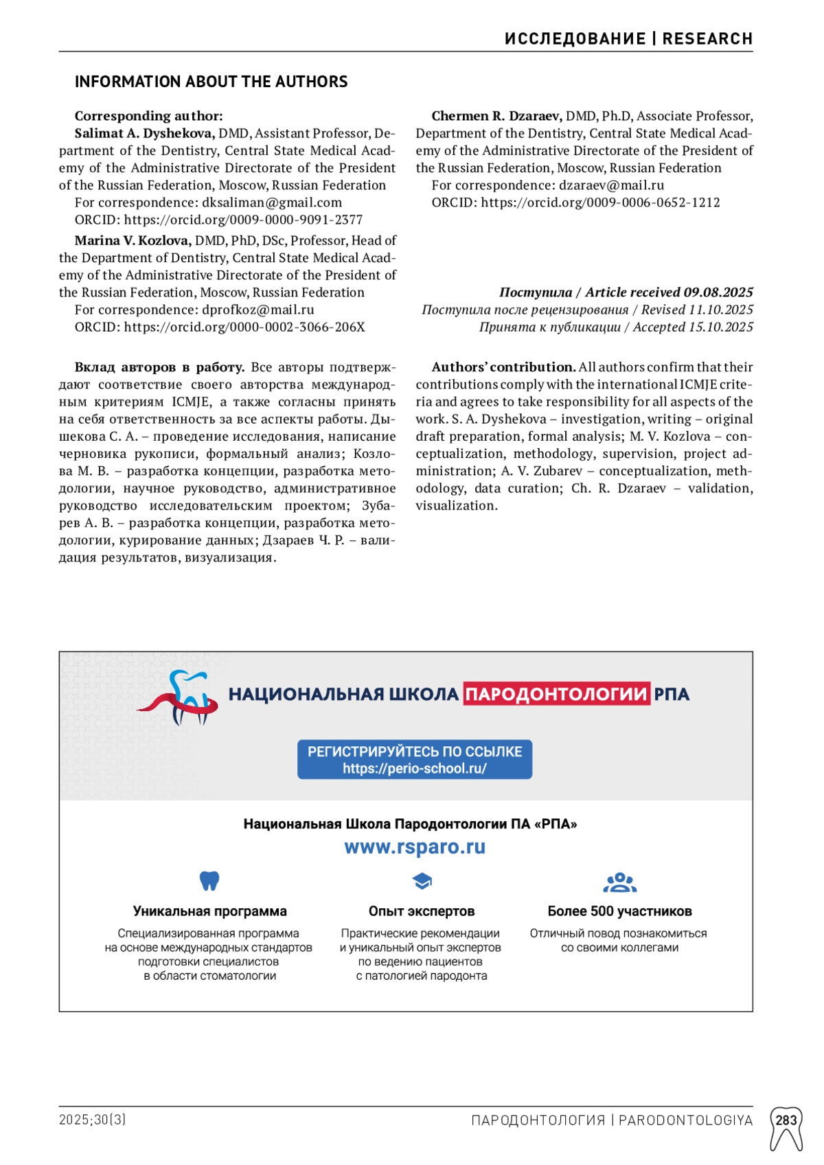 Актуальность. Важную роль в развитии воспалительных заболеваний пародонта играют системные заболевания, особенно эндокринные нарушения, которые влияют на иммунный ответ организма. В частности, гипотиреоз ассоциируется с ухудшением состояния зубов и пародонта, снижением гигиены, высокой частотой пародонтита и кариеса, а также с активизацией воспалительных процессов в тканях пародонта. Все это требует комплексного подхода к диагностике и лечению пациентов с гипотиреозом, учитывая взаимодействие эндокринной и стоматологической патологии. Цель. Оценить эффективность усовершенствованного алгоритма лечения воспалительных заболеваний пародонта у пациентов с гипотиреозом. Материалы и методы. Исследование проводилось в два этапа. На первом этапе мы оценивали состояние пародонта пациентов с гипотиреозом в зависимости от формы заболевания. Для этого все исследуемые пациенты были разделены на три группы: 1. Пациенты с ВЗП и субклинической формой гипотиреоза (n = 49); 2. Пациенты с ВЗП и манифестной формой гипотиреоза (n = 95); 3. Контрольная группа (пациенты с ВЗП и без патологии щитовидной железы) (n = 30). Во втором этапе исследования участвовали 136 пациентов с первичным гипотиреозом и воспалительными заболеваниями пародонта легкой и средней степени тяжести, которые были разделены на две группы в зависимости от вида терапии. Группа сравнения (52 человека) получала стандартное лечение воспалительных заболеваний пародонта. Основная группа (84 человека) лечилась по усовершенствованному алгоритму с добавлением препаратов геля с бактериофагами и экстракта звездчатки средней, а также физиотерапии аппаратом АЛСТ – 01 «Оптодан». Эффективность лечения оценивали по пародонтограмме до и после терапии. Результаты. Результаты, полученные в ходе первого этапа нашего исследования, демонстрируют выраженные различия в состоянии пародонта между группами с субклинической и манифестной формами заболевания. На втором этапе исследования установлено, что после лечения во всех группах значительно снизились индексы OHI-S, PDI, PMA и PBI, причем наибольшие улучшения отмечены в основной группе. Заключение. Пациенты с ВЗП и манифестным гипотиреозом представляют группу особо высокого риска по развитию пародонтита с быстрым прогрессированием. Подтверждена высокая эффективность предложенного алгоритма лечения воспалительных заболеваний пародонта, способствующая снижению воспаления, улучшению клинических показателей и стабилизации состояния пародонта.
