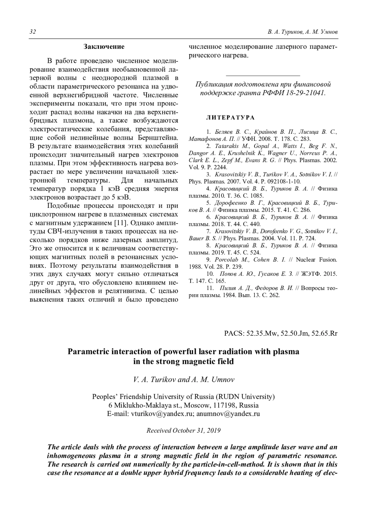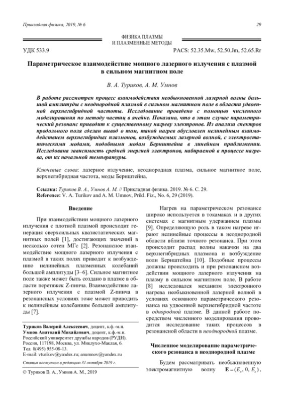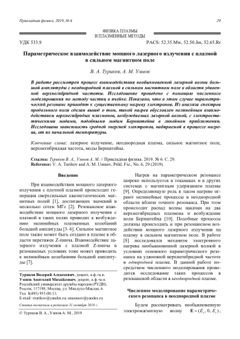 Туриков В. А., Умнов А. М. Параметрическое взаимодействие мощного лазерного излучения с плазмой в сильном магнитном поле 29