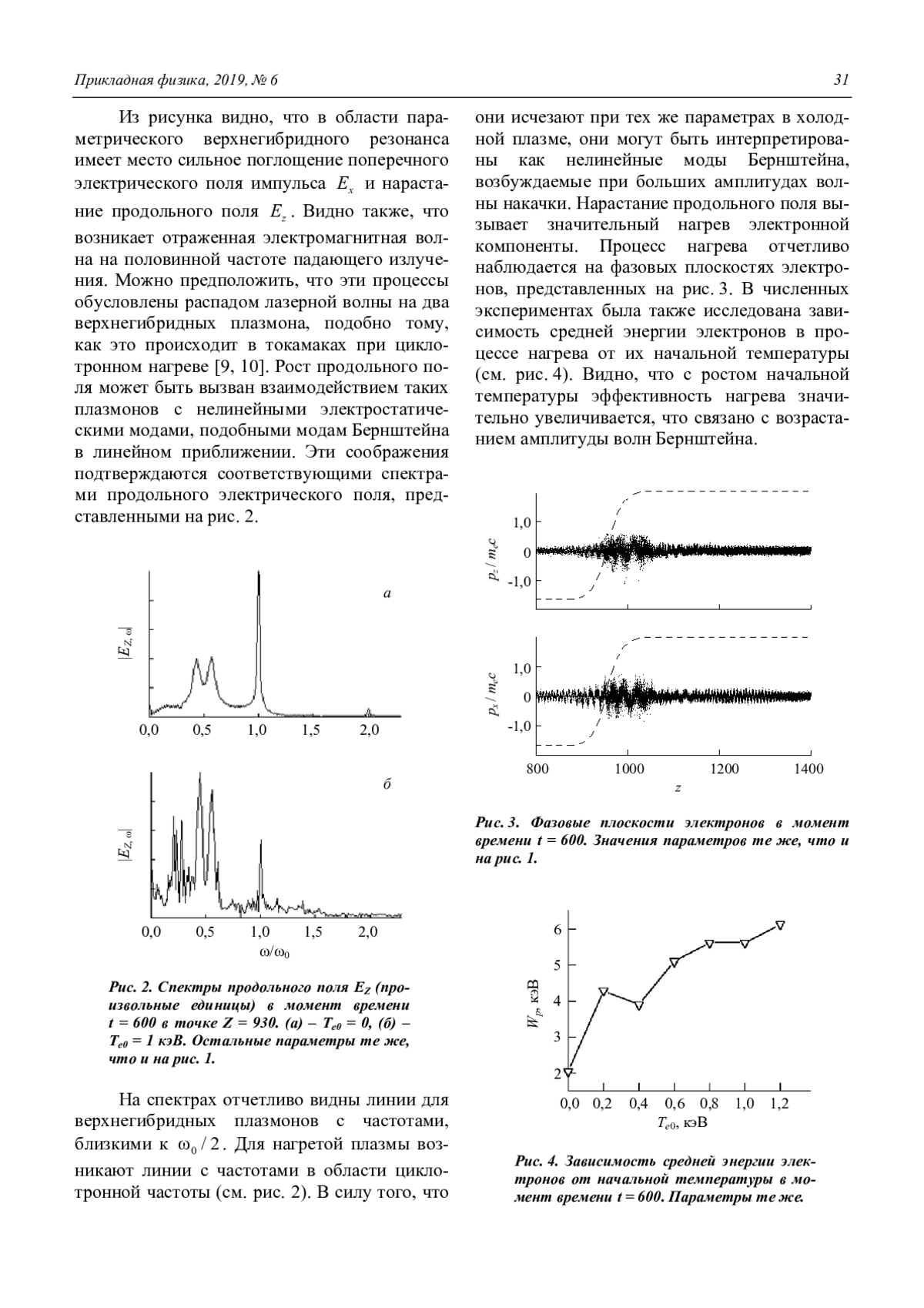 Подобные процессы происходят и при циклотронном нагреве в плазменных системах с магнитным удержанием [11]. Однако амплитуды СВЧ-излучения в таких процессах на несколько порядков ниже лазерных амплитуд. Это же относится и к величинам соответствующих магнитных полей в резонансных условиях. Поэтому результаты взаимодействия в этих двух случаях могут сильно отличаться друг от друга, что обусловлено влиянием нелинейных эффектов и релятивизма. С целью выяснения таких отличий и было проведено численное моделирование лазерного параметрического нагрева.