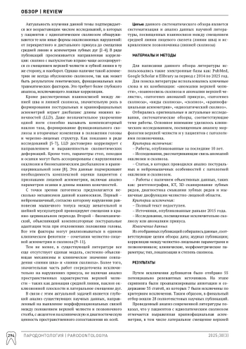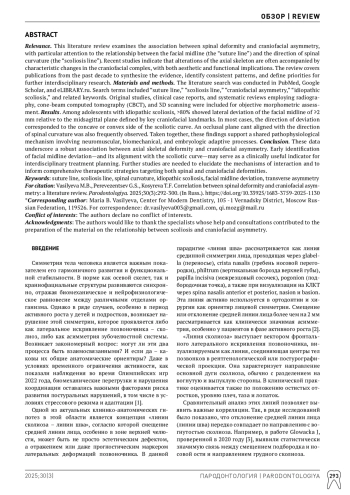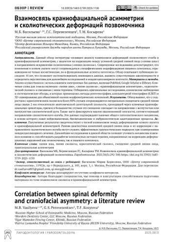 Актуальность. Данный обзор литературы посвящен анализу взаимосвязи деформаций позвоночного столба и краниофациальной асимметрии, с акцентом на корреляцию между условной средней линией лица («линия шва») и направлением искривления позвоночника («линия сколиоза»). Современные исследования демонстрируют, что изменения в осевом скелете могут сопровождаться специфическими модификациями лицевого комплекса, отражающими не только косметические, но и функциональные аспекты патогенеза. Обзор охватывает публикации последних 10 лет, что позволяет систематизировать имеющиеся данные, выявить существующие закономерности и определить перспективы для дальнейших исследований в междисциплинарном контексте. Материалы и методы. Анализ осуществлялся с использованием электронных баз данных, включая PubMed, Google Scholar и Elibrary. Ключевые слова для поиска включали «линия шва», «линия сколиоза», «краниофациальная асимметрия», «идиопатический сколиоз» и связанные с ними термины. Отбирались оригинальные исследования, клинические наблюдения и систематические обзоры, в которых применялись методы рентгенографии, компьютерной томографии (КЛКТ) и 3D-сканирования для объективной оценки морфометрических изменений. Результаты. Обзор выявил, что у подростков с идиопатическим сколиозом более 80% случаев сопровождаются латеральным смещением средней линии лица свыше 2 мм относительно анатомической сагиттальной плоскости, проходящей через ключевые краниофациальные ориентиры, причем в большинстве случаев это смещение совпадает по направлению с вогнутостью или выпуклостью сколиотической дуги. Также часто фиксируется наклон окклюзионной плоскости, соответствующий направлению сколиотического изгиба. Эти данные подтверждают наличие общего патогенетического механизма, в основе которого лежат нейромышечные, биомеханические и эмбриологические адаптационные процессы. Заключение. Полученные результаты свидетельствуют о тесной взаимосвязи между деформациями осевого скелета и краниофациальной асимметрией. Ранняя диагностика изменений средней линии лица и их корреляция с направлением сколиотического изгиба могут служить эффективным прогностическим маркером при планировании междисциплинарного лечения. Дальнейшие исследования в данной области позволят уточнить механизмы взаимного влияния и способствовать разработке комплексных методов терапии, направленных на коррекцию деформационных нарушений как позвоночника, так и лицевого комплекса.