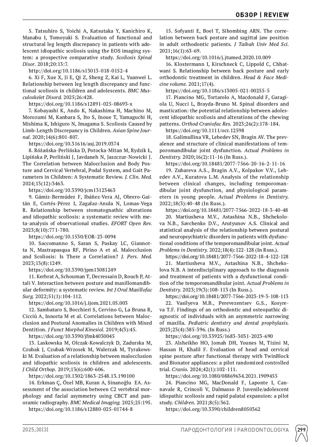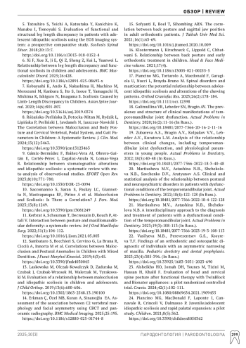 10. Saccomanno S, Saran S, Paskay LC, Giannotta N, Mastrapasqua RF, Pirino A et al. Malocclusion and Scoliosis: Is There a Correlation? J. Pers. Med. 2023;13(8):1249. DOI: 10.3390/jpm13081249