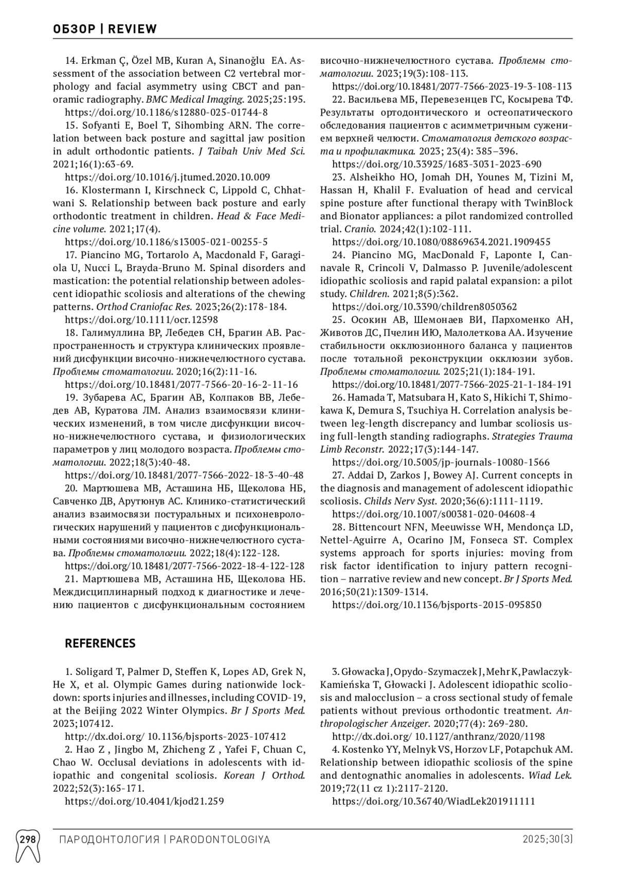 20. Мартюшева МВ, Асташина НБ, Щеколова НБ, Савченко ДВ, Арутюнув АС. Клинико-статистический анализ взаимосвязи постуральных и психоневрологических нарушений у пациентов с дисфункциональными состояниями височно-нижнечелюстного сустава. Проблемы стоматологии. 2022;18(4):122-128. DOI: 10.18481/2077-7566-2022-18-4-122-128