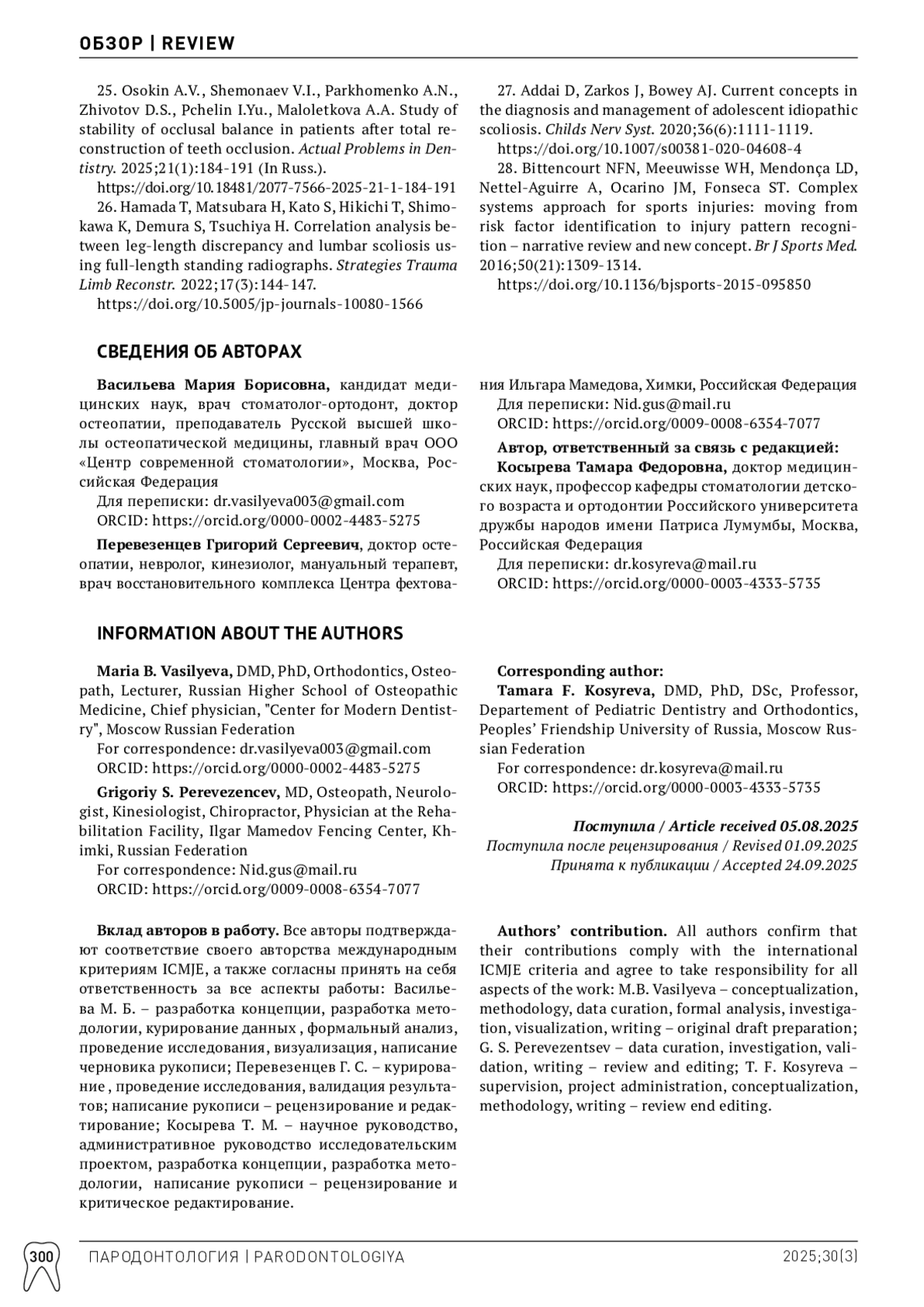 25. Осокин АВ, Шемонаев ВИ, Пархоменко АН, Животов ДС, Пчелин ИЮ, Малолеткова АА. Изучение стабильности окклюзионного баланса у пациентов после тотальной реконструкции окклюзии зубов. Проблемы стоматологии. 2025;21(1):184-191. DOI: 10.18481/2077-7566-2025-21-1-184-191