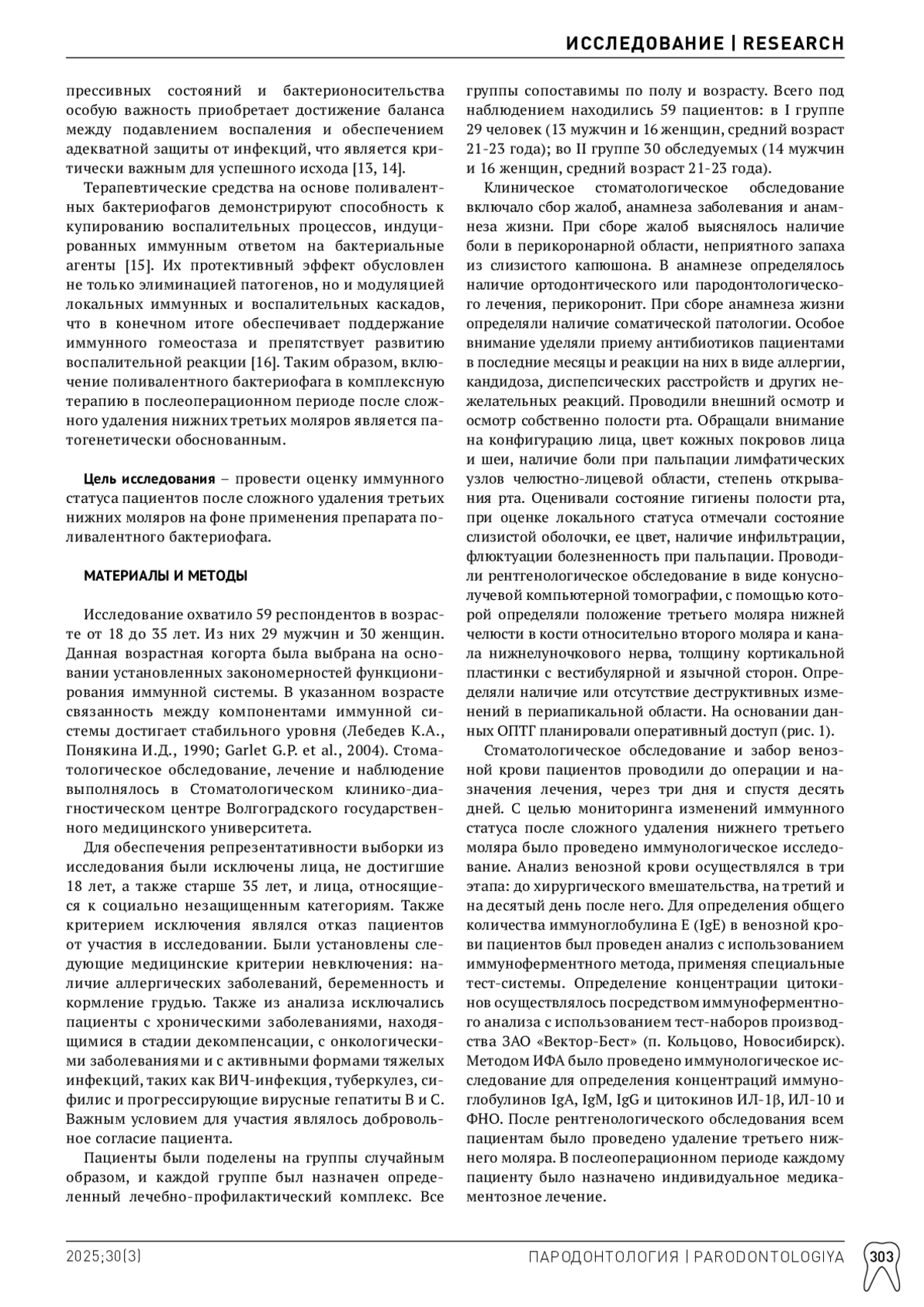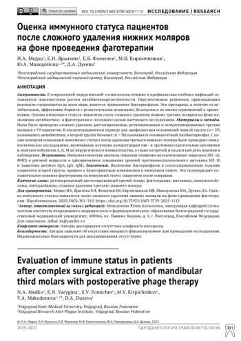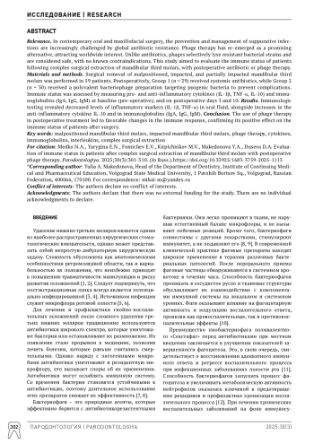 Актуальность. В современной хирургической стоматологии лечение и профилактика гнойных инфекций осложняется повсеместным ростом антибиотикорезистентности. Перспективным решением, привлекающим внимание специалистов во всем мире, является применение бактериофагов. Эти препараты, в отличие от антибиотиков, эффективно борются с резистентными штаммами, безопасны и не имеют ограничений к применению. Оценка иммунного статуса пациентов после сложного удаления нижних третьих моляров на фоне назначения антибиотико- и фаготерапии и послужило целью настоящего исследования. Материалы и методы. Нами было проведено сложное удаление дистопированных, ретинированных и полуретинированных третьих моляров у 59 пациентов. В послеоперационном периоде для профилактики осложнений первой группе (n = 29) назначались антибиотики, а второй группе больных (n = 30) назначался поливалентный пиобактериофаг. С целью контроля изменений иммунного статуса после удаления третьего нижнего моляра было проведено иммунологическое исследование, включающее изучение концентрации про- и противовоспалительных цитокинов и иммуноглобулинов A, G, M до хирургического вмешательства, а также на третий и на десятый день ведения и наблюдения. Результаты. Иммунологические анализы показали снижение воспалительных маркеров (ИЛ-1β, ФНО) в ротовой жидкости и одновременное повышение уровней противовоспалительного цитокина ИЛ-10 и защитных антител (IgA, IgG, IgM). Заключение. Включение бактериофагов в послеоперационную терапию пациентов второй группы привело к благоприятным изменениям в иммунном ответе. Это подтверждает положительное влияние фаготерапии на иммунный статус пациентов после операции.