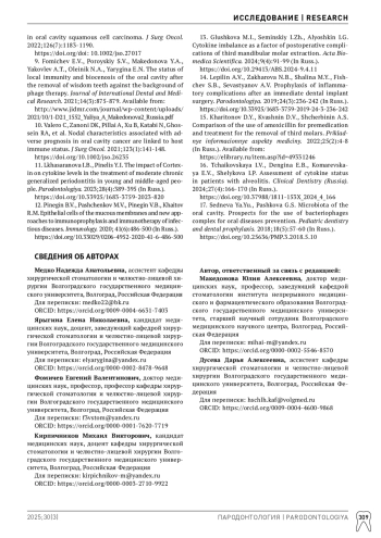 9. Fomichev EV, Poroyskiy SV, Makedonova YA, Yakovlev AT, Oleinik NA, Yarygina EN. Тhe status of local immunity and biocenosis of the oral cavity after the removal of wisdom teeth against the background of phage therapy. Journal of International Dental and Medical Research. 2021;14(3):875-879. Available from: http://www.jidmr.com/journal/wp-content/uploads/2021/10/1-D21_1552_Yuliya_A_Makedonova2_Russia.pdf.