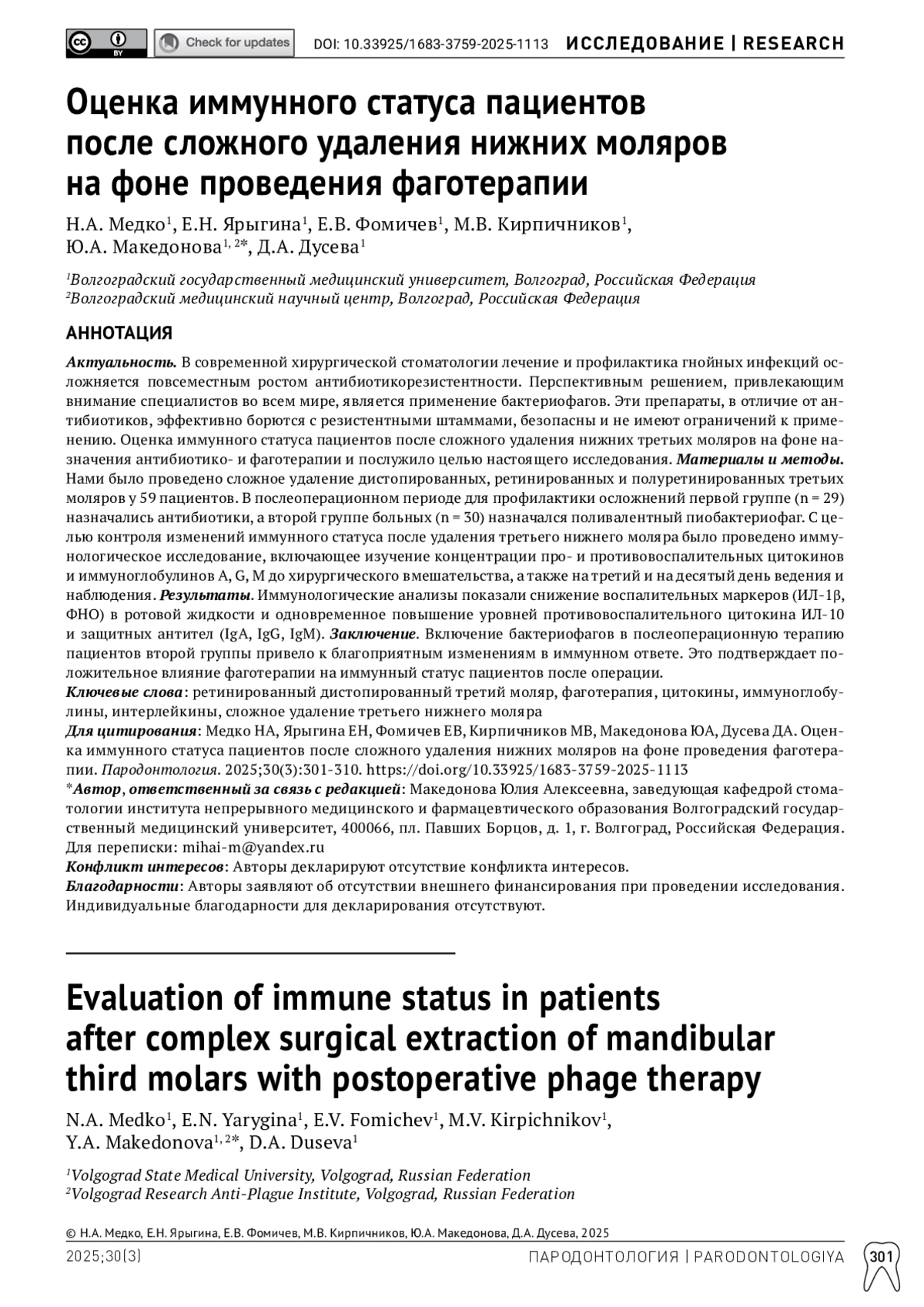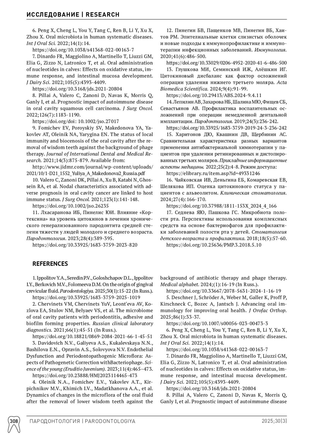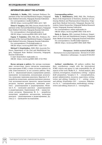 1. Ипполитов ЮА, Середин ПВ, Голощапов ДЛ, Ипполитов ИЮ, Беркович МВ, Фоломеева ДМ. К вопросу о происхождении десневой жидкости. Пародонтология. 2025;30(1):15-22. DOI: 10.33925/1683-3759-2025-1019