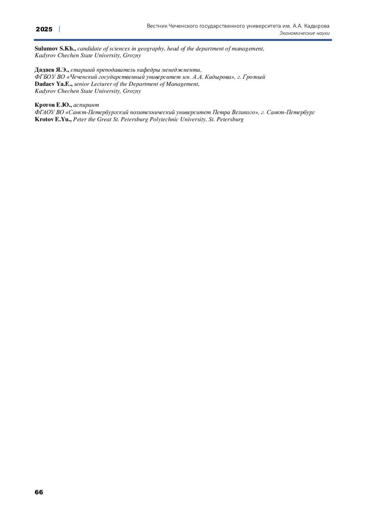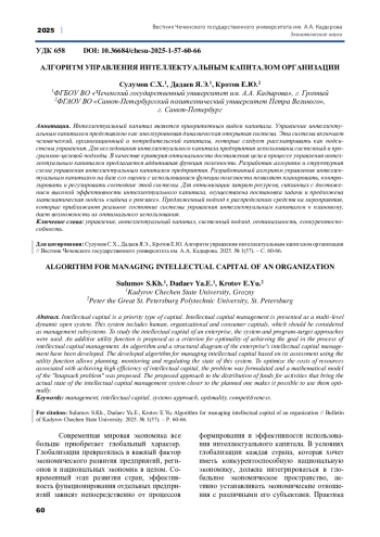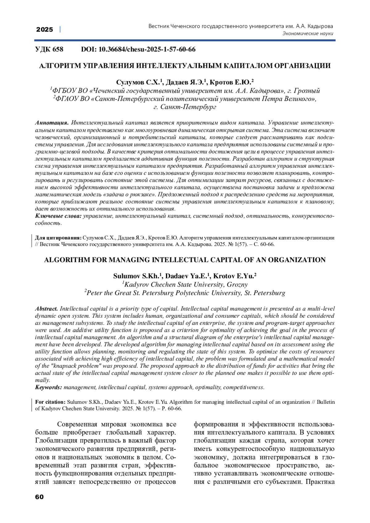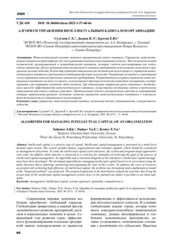 8. Сулумов С.Х., Быкова В.И., Абдуллаева З.М. Оценка интеллектуального капитала в условиях цифровизации экономики /// Вестник Чеченского государственного университета им. А.А. Кадырова. 2024. № 3(55). - С. 42-50. EDN: LFOTAR