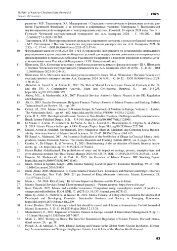 11. Шовхалов, Ш.А. Ключевые тенденции и проблемы развития исламских финансов в мире / Ш.А. Шовхалов // Вестник Чеченского государственного университета им. А.А. Кадырова. 2023. № 2(50). - С. 44-50. DOI: 10.36684/chesu-2023-50-2-44-50 EDN: EJWCKR