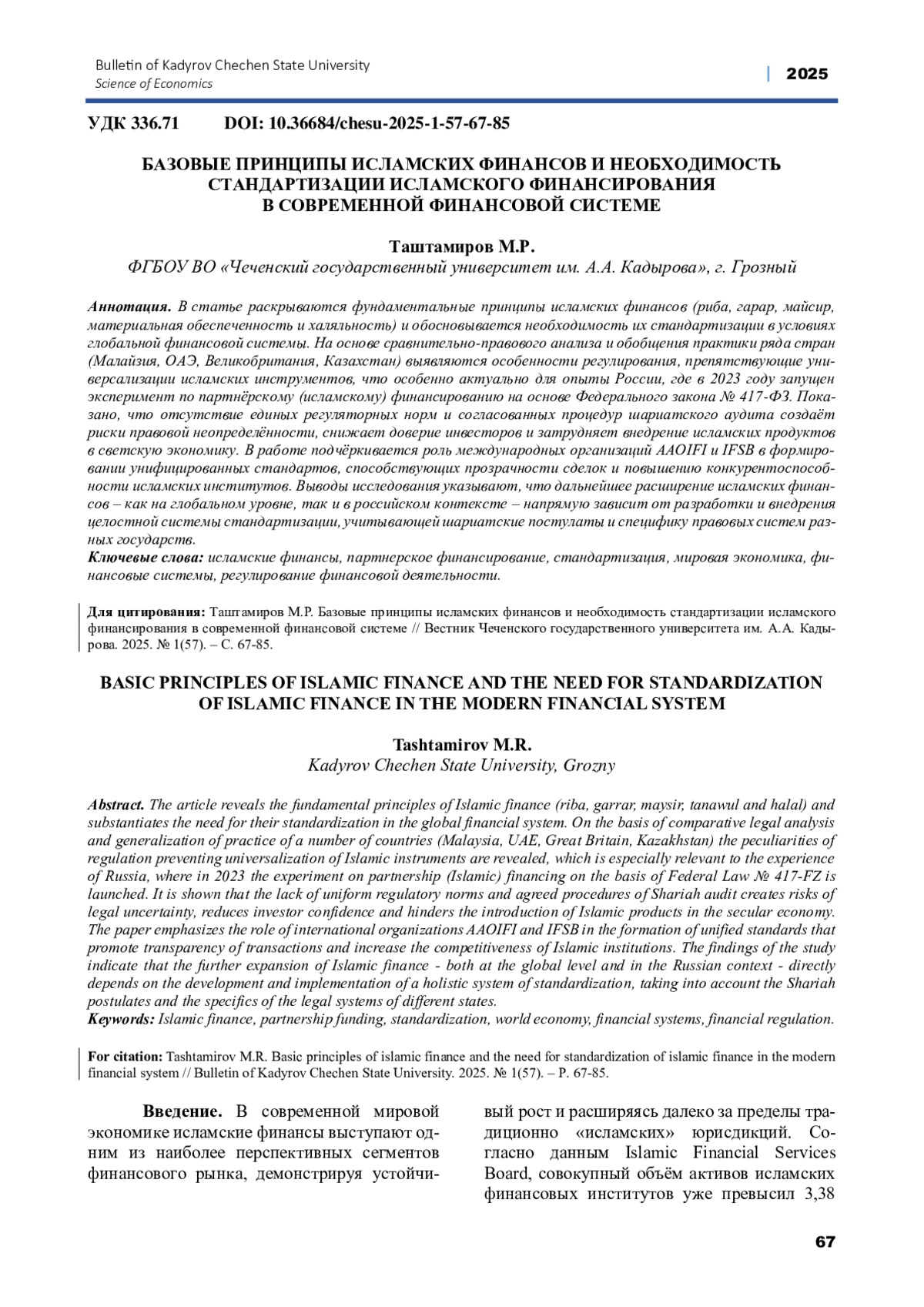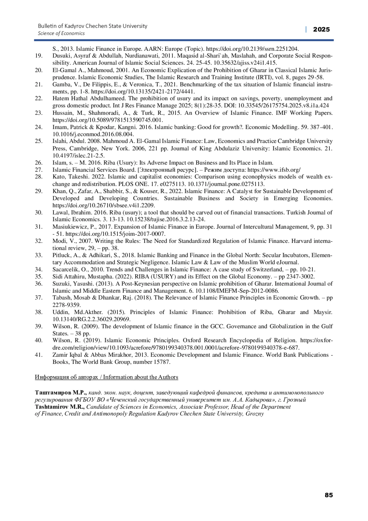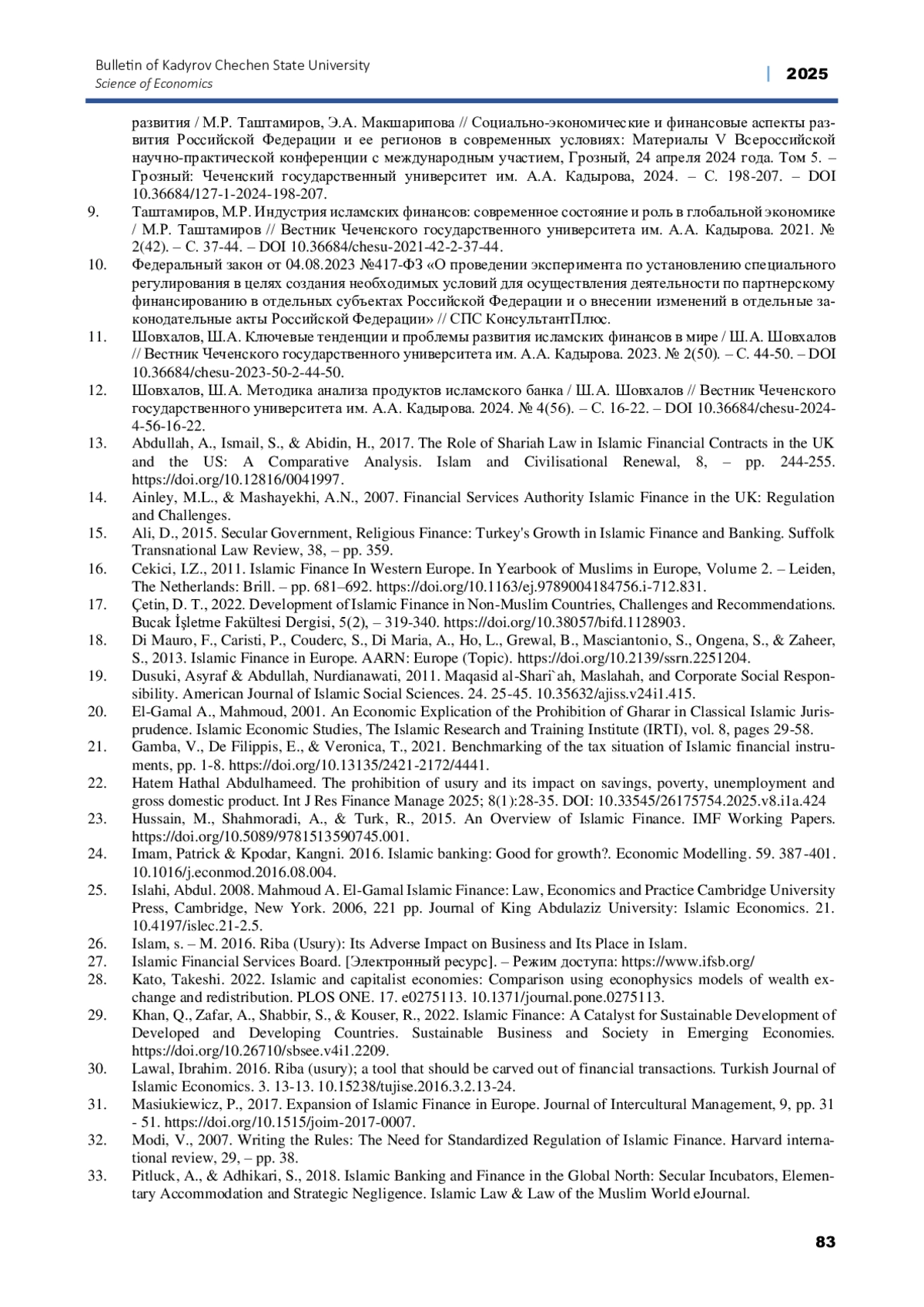 9. Таштамиров, М.Р. Индустрия исламских финансов: современное состояние и роль в глобальной экономике / М.Р. Таштамиров // Вестник Чеченского государственного университета им. А.А. Кадырова. 2021. № 2(42). - С. 37-44. DOI: 10.36684/chesu-2021-42-2-37-44 EDN: ILBZYV