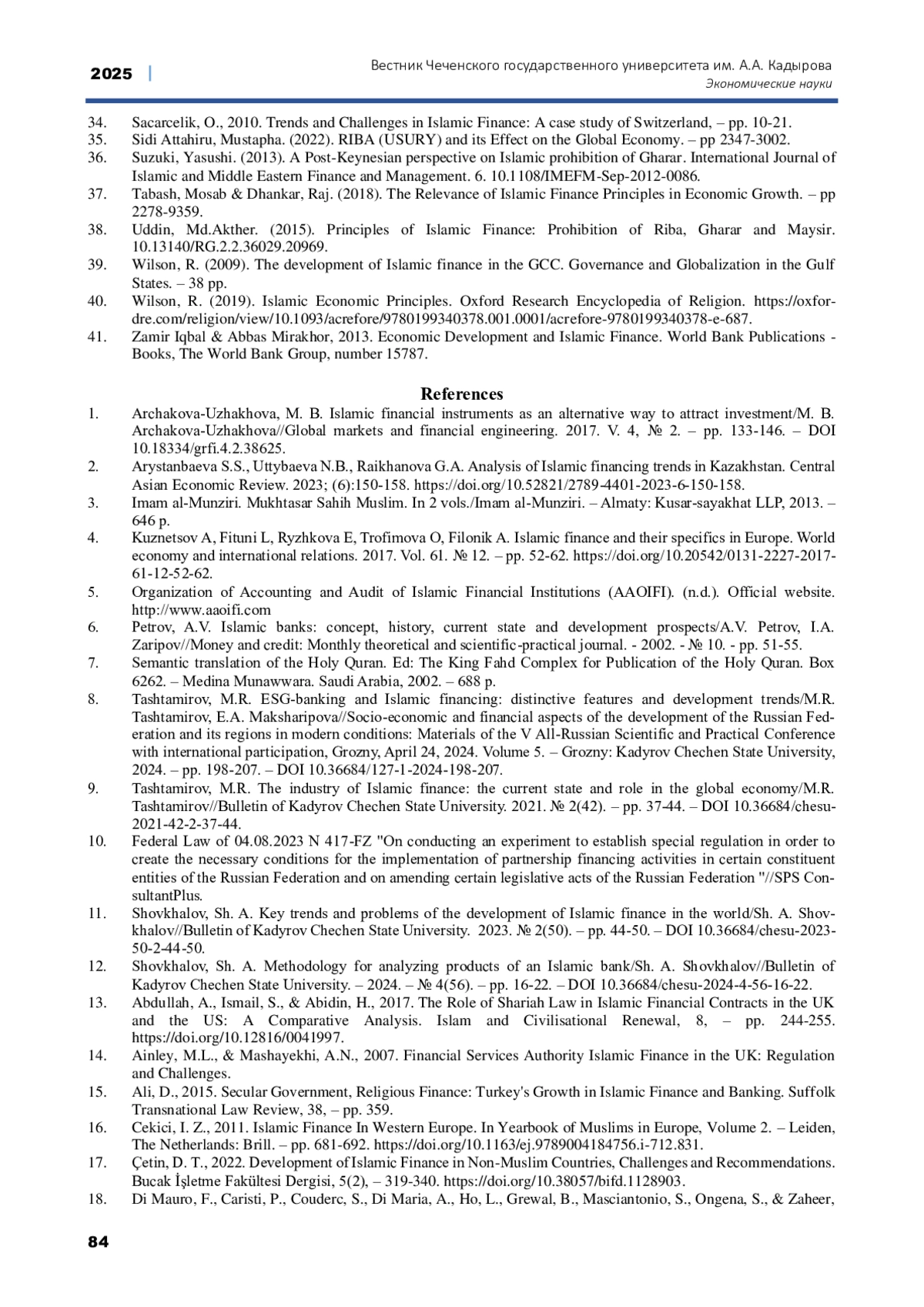 1. Арчакова-Ужахова, М.Б. Исламские финансовые инструменты как альтернативный способ привлечения инвестиций / М.Б. Арчакова-Ужахова // Глобальные рынки и финансовый инжиниринг. 2017. Т. 4, № 2. - С. 133-146. DOI: 10.18334/grfi.4.2.38625 EDN: YMCEVD