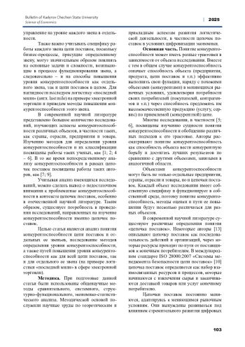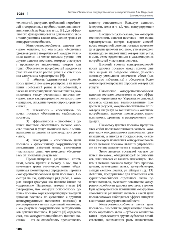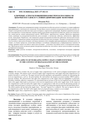 В статье рассматривается вопрос конкурентоспособности цепочек поставок в условиях цифровых трансформаций и экономических изменений. Осуществлен анализ понятия конкурентоспособности цепочек поставок и конкурентоспособности звена цепи поставок в современной литературе. В работе приведены возможные качественные и количественные методы определения уровня конкурентоспособности, такие как метод баллов, метод рангов, метод интегральной оценки, SWOT-анализ, эвристические методы. Выделены характеристики, влияющие на конкурентоспособность цепи поставок, в частности гибкость, надежность, эффективность, интеграция. Определено, что повышение уровня конкурентоспособности отдельных звеньев цепи поставок приводит к повышению уровня конкурентоспособности всей цепи поставок. В разрезе конкурентоспособности последнего звена цепи поставок уместным является учет специфики функционирования участника цепи поставок, его бизнес-процессов, количества входящих и исходящих материальных и информационных потоков. В статье проведен анализ последнего звена цепи поставок - логистики «последней мили» в электронной коммерции. Предложены пути улучшения уровня конкурентоспособности «последнего звена» цепи поставок на примере электронной коммерции.