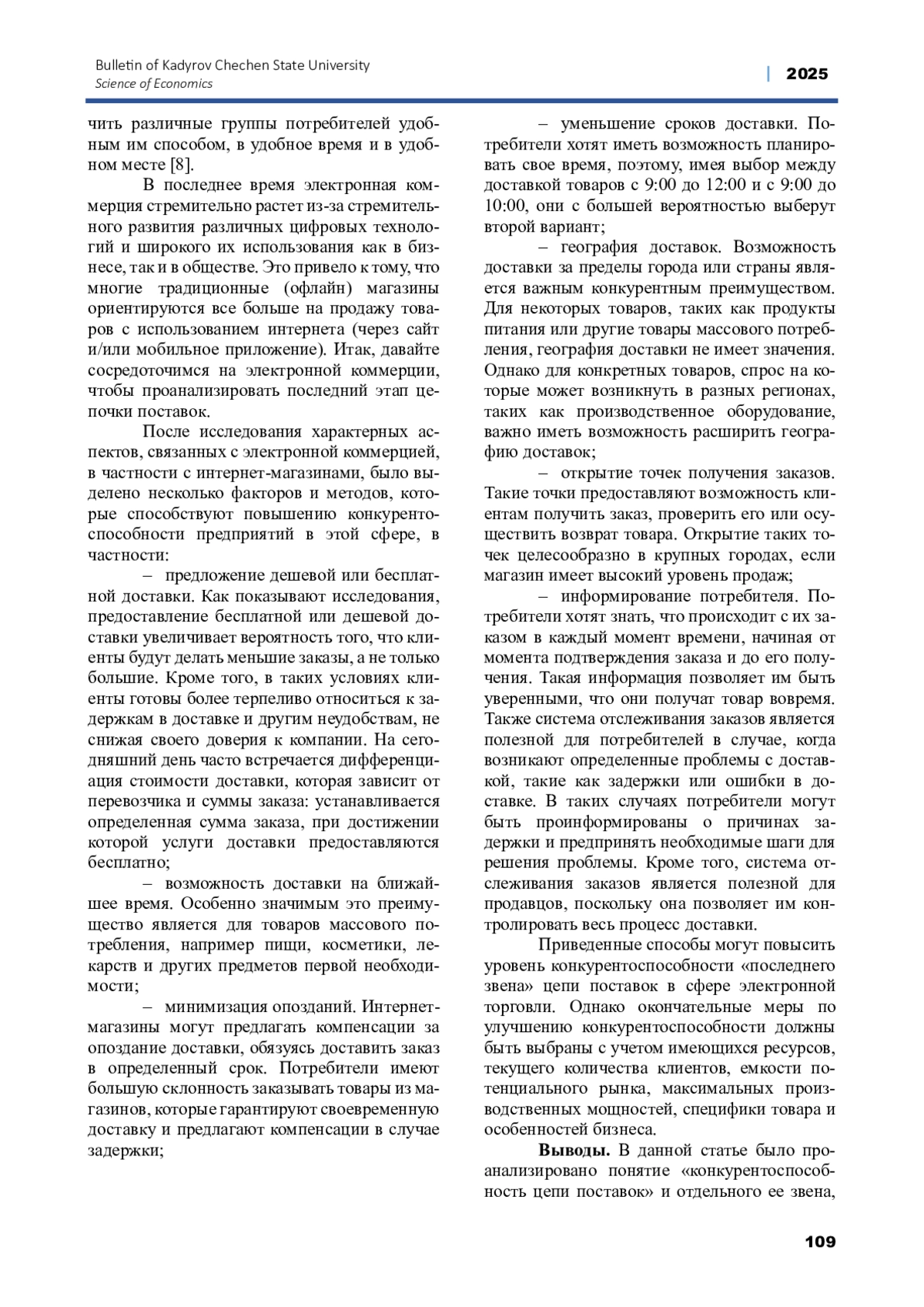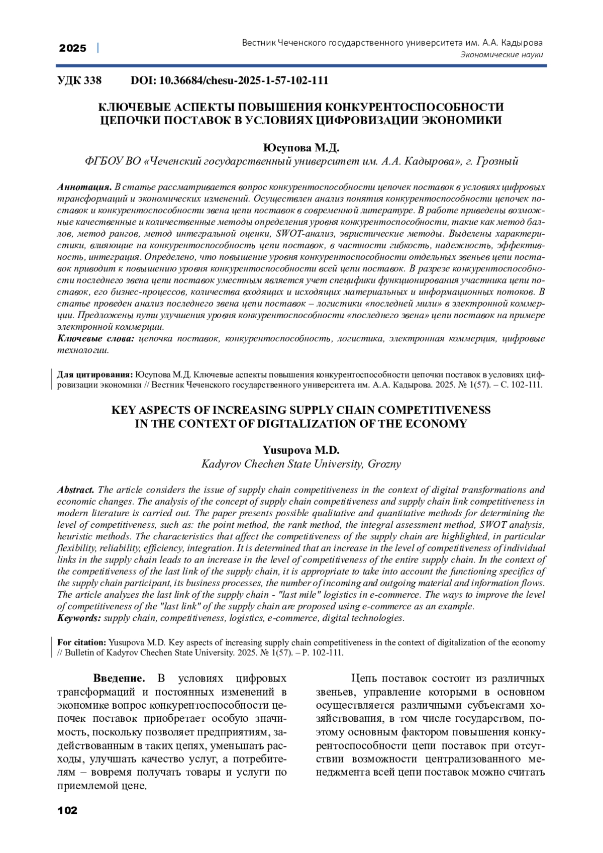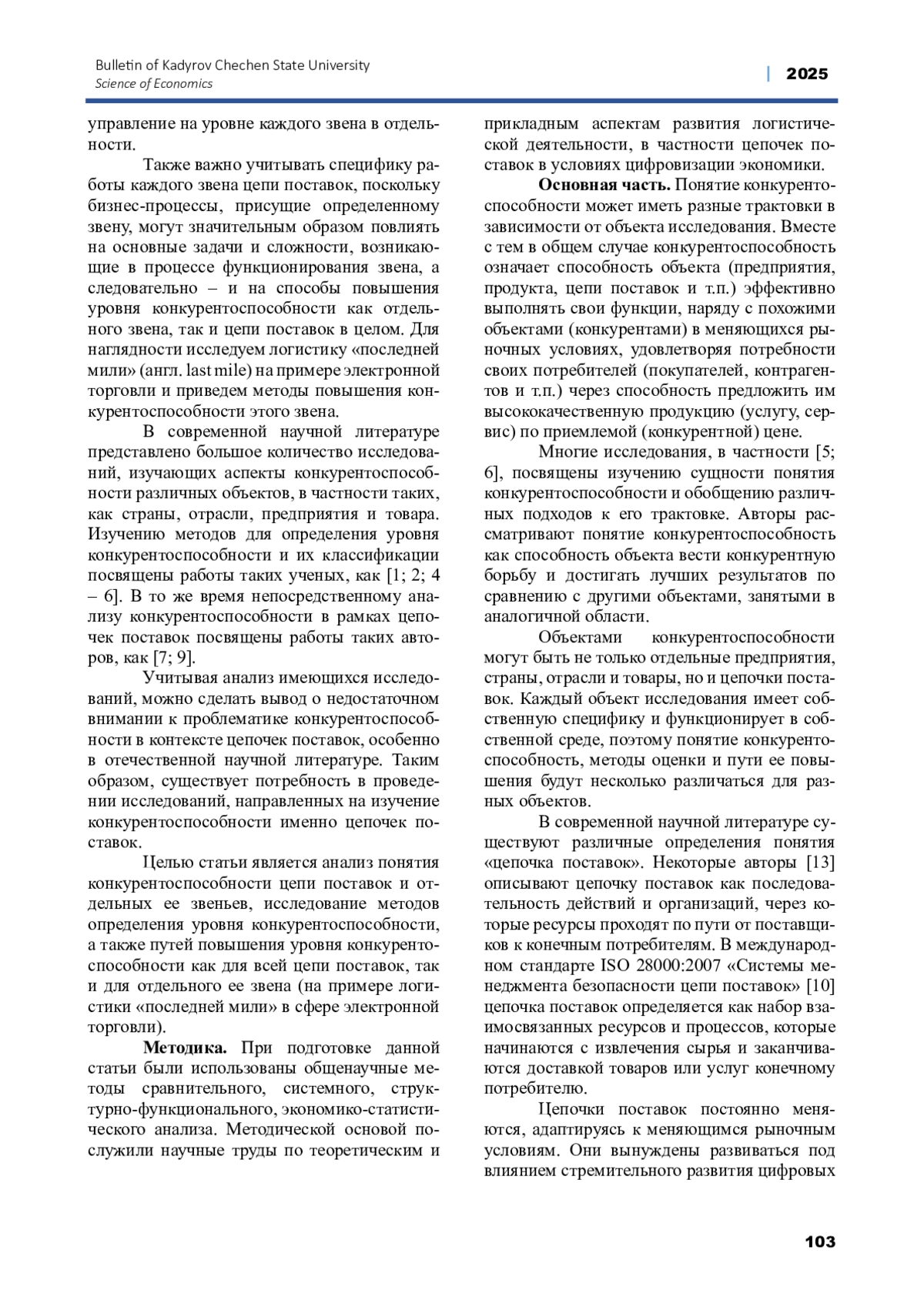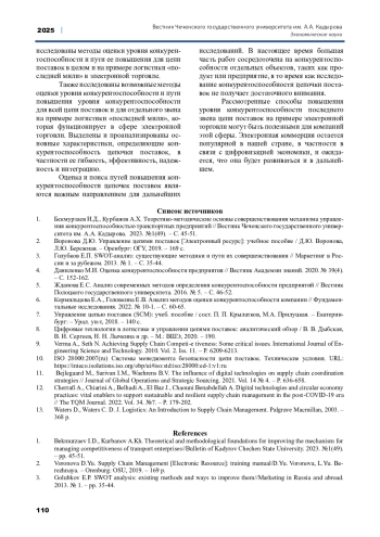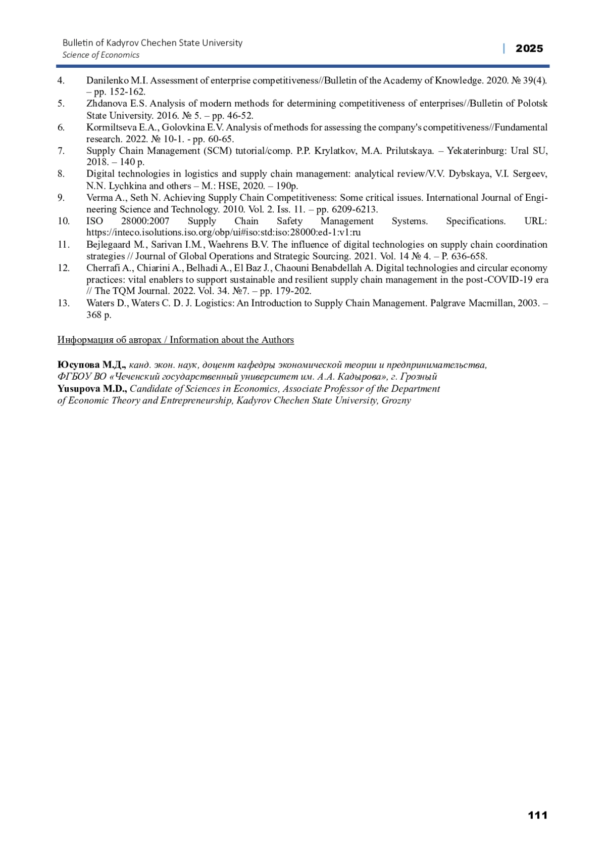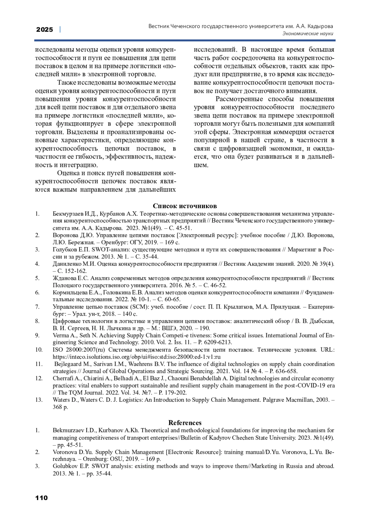 1. Бекмурзаев И.Д., Курбанов А.Х. Теоретико-методические основы совершенствования механизма управления конкурентоспособностью транспортных предприятий // Вестник Чеченского государственного университета им. А.А. Кадырова. 2023. №1(49). - С. 45-51. EDN: PCJCFN