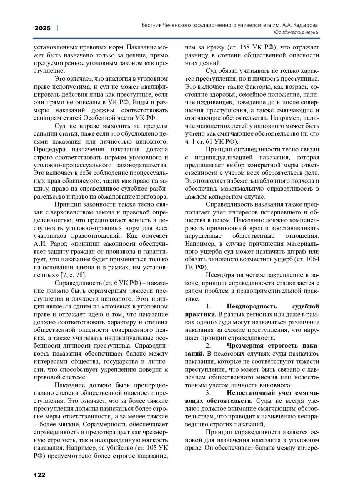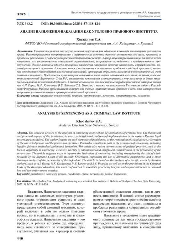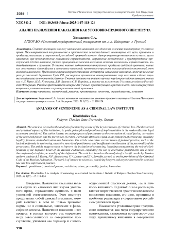 Статья посвящена анализу назначения наказания как одного из ключевых институтов уголовного права. Рассматриваются теоретические и практические аспекты данного института, его цели, принципы и проблемы реализации в современной российской правовой системе. Автор акцентирует внимание на таких целях наказания, как восстановление социальной справедливости, исправление осужденного и предупреждение преступлений. Особое внимание уделено принципам назначения наказания, включая законность, справедливость, индивидуализацию и гуманизм. В статье также поднимаются актуальные проблемы судебной практики, такие как отсутствие единообразия в назначении наказаний, чрезмерная строгость наказаний и недостаточный учет личности виновного. Предложены пути совершенствования института назначения наказания, включая усиление роли разъяснений Верховного Суда РФ, расширение применения альтернативных мер наказания и более тщательный анализ личности подсудимого. Статья основана на анализе научных трудов российских авторов, таких как А. И. Рарог, Н. Ф. Кузнецова, В. В. Лунеев и С. В. Бородин, а также на положениях Уголовного кодекса Российской Федерации. Работа представляет интерес для ученых, практикующих юристов и всех, кто интересуется вопросами уголовного права и правоприменительной практики.