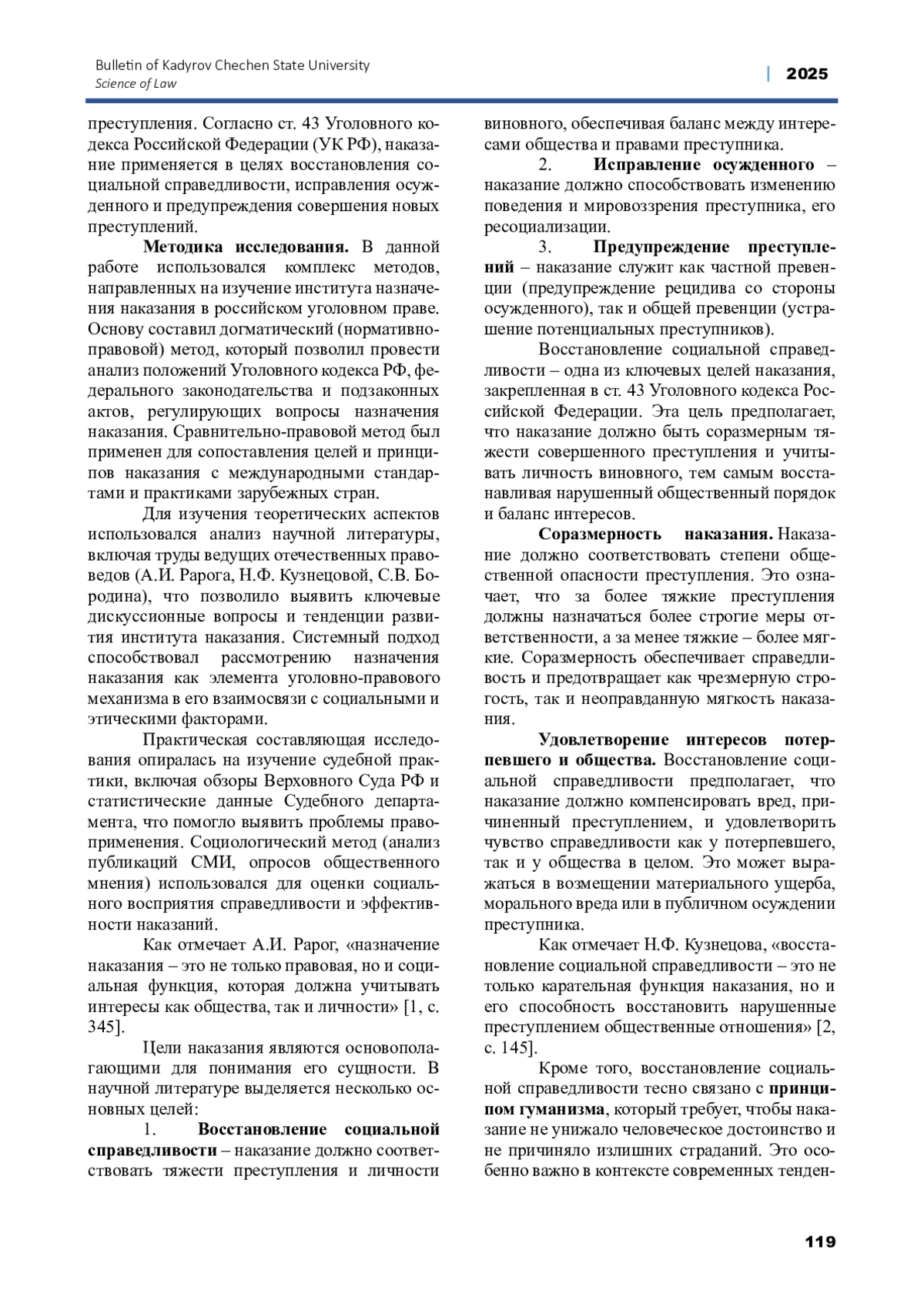 Статья посвящена комплексному анализу уголовно-правовых санкций как инструмента правового регулирования ответственности за преступления. Рассматриваются их виды, функциональное назначение, а также актуальные проблемы применения в современной российской правовой системе. На основе исследований отечественных ученых (А. И. Рарог, В. Д. Филимонов, Н. Ф. Кузнецова и др.) раскрывается роль санкций в реализации принципов справедливости, законности и гуманизма. Особое внимание уделено дисбалансам в практике назначения наказаний, включая неопределенность формулировок, региональную вариативность и чрезмерное использование лишения свободы. Авторы предлагают пути оптимизации санкций: сужение диапазонов относительно-определенных наказаний, расширение альтернативных мер воздействия и унификацию судебного подхода. Результаты исследования могут быть использованы для совершенствования уголовного законодательства и правоприменительной практики, а также в научной дискуссии о балансе карательных и восстановительных функций права. Статья адресована юристам, законодателям и исследователям в области уголовного права.