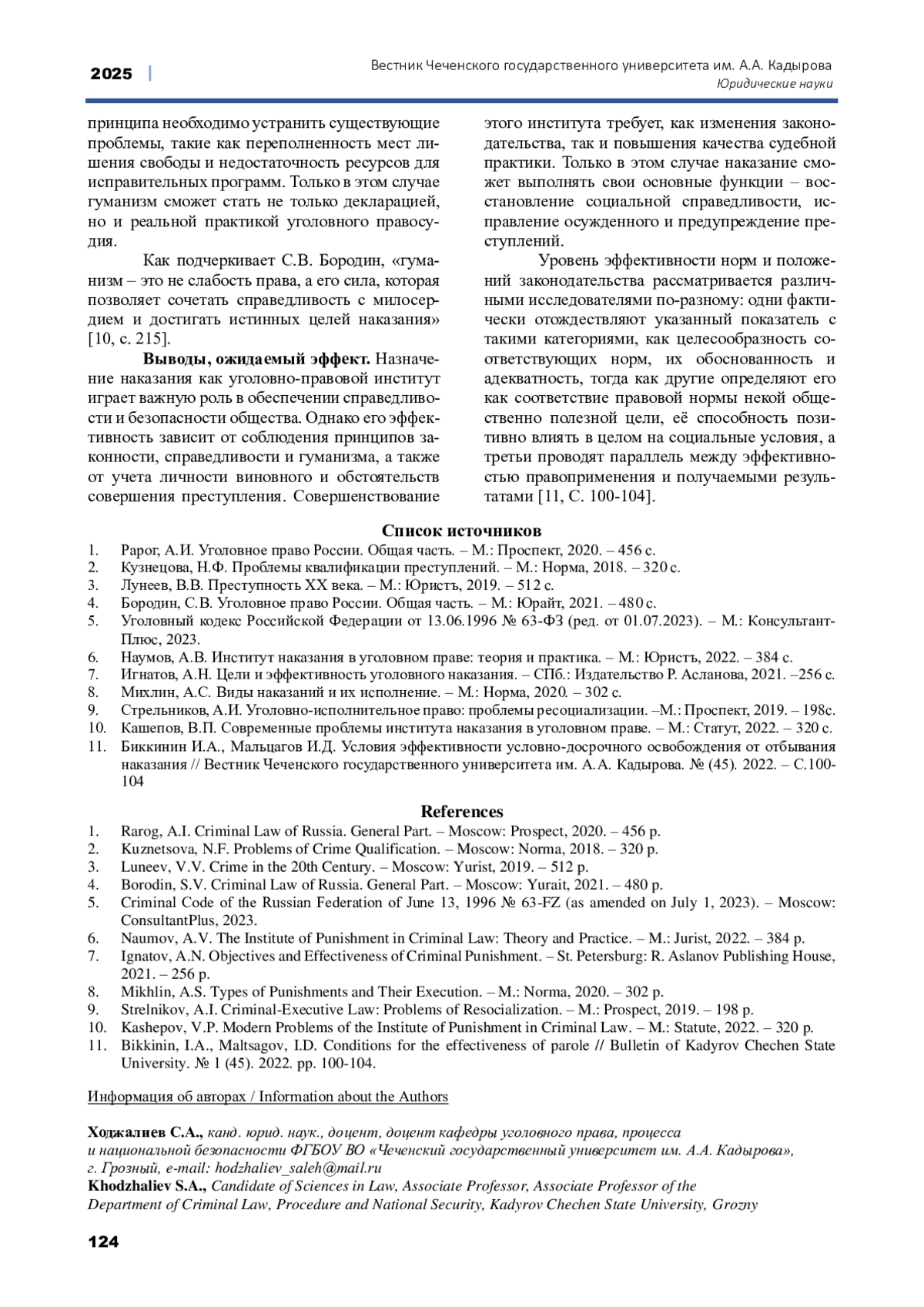 11. Биккинин И.А., Мальцагов И.Д. Условия эффективности условно-досрочного освобождения от отбывания наказания // Вестник Чеченского государственного университета им. А.А. Кадырова. № (45). 2022. - С.100-104. EDN: ROXUXX