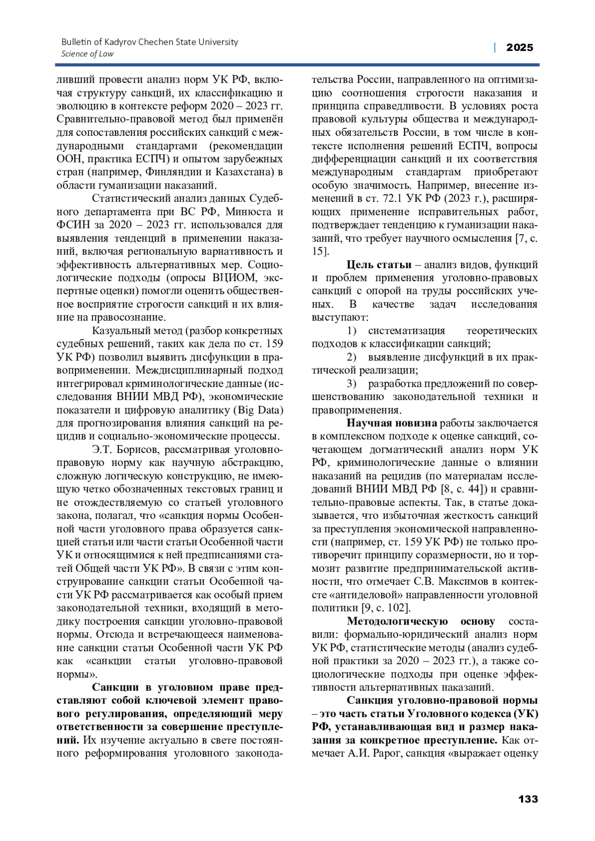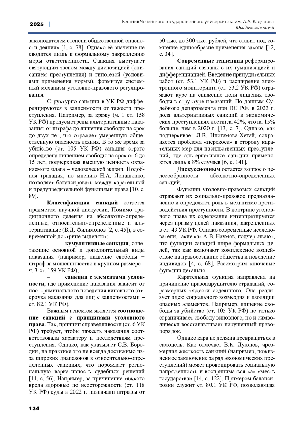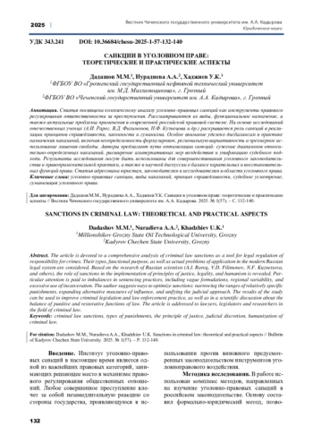 Статья посвящена комплексному анализу уголовно-правовых санкций как инструмента правового регулирования ответственности за преступления. Рассматриваются их виды, функциональное назначение, а также актуальные проблемы применения в современной российской правовой системе. На основе исследований отечественных ученых (А. И. Рарог, В. Д. Филимонов, Н. Ф. Кузнецова и др.) раскрывается роль санкций в реализации принципов справедливости, законности и гуманизма. Особое внимание уделено дисбалансам в практике назначения наказаний, включая неопределенность формулировок, региональную вариативность и чрезмерное использование лишения свободы. Авторы предлагают пути оптимизации санкций: сужение диапазонов относительно-определенных наказаний, расширение альтернативных мер воздействия и унификацию судебного подхода. Результаты исследования могут быть использованы для совершенствования уголовного законодательства и правоприменительной практики, а также в научной дискуссии о балансе карательных и восстановительных функций права. Статья адресована юристам, законодателям и исследователям в области уголовного права.