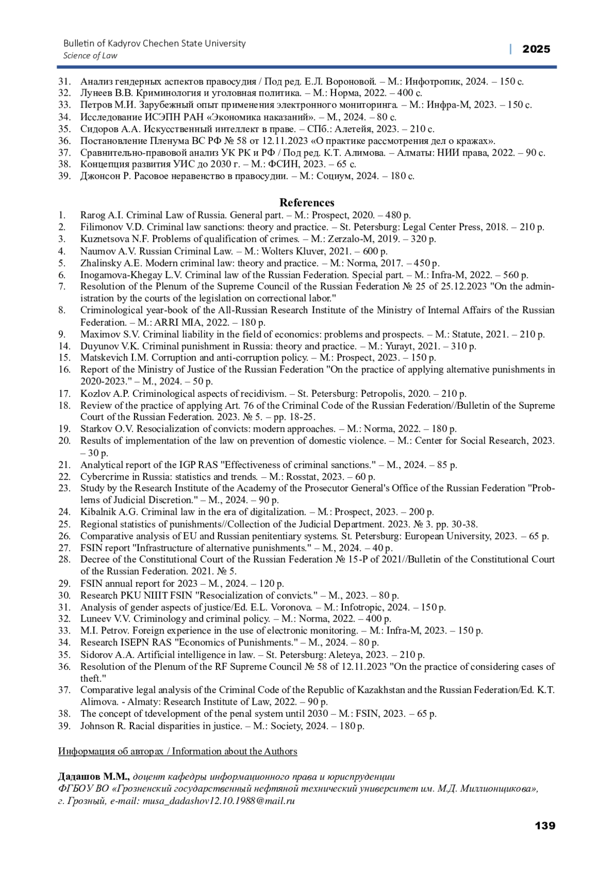 10. Дуюнов В.К. Уголовное наказание в России: теория и практика. - М.: Юрайт, 2021. - 310 с.