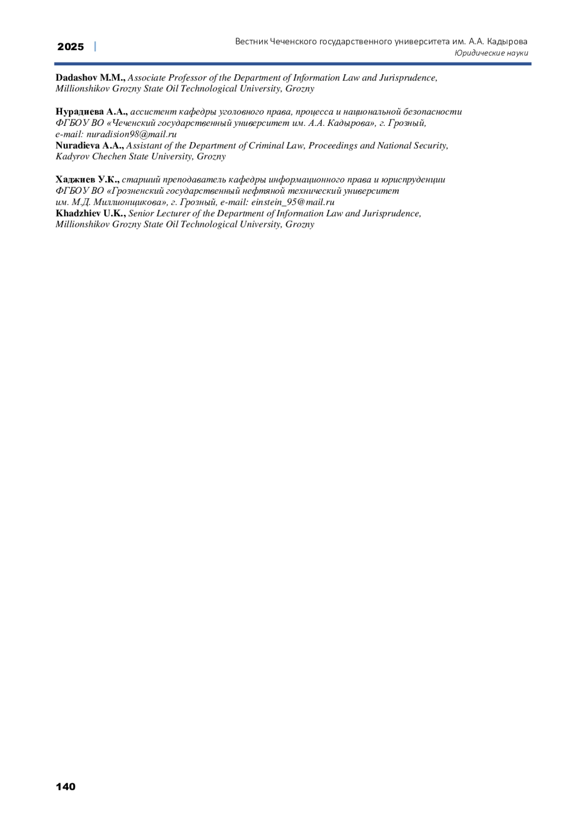 Современный этап развития общества характеризуется глобальной цифровой трансформацией, оказывающей значительное влияние на правовую систему. Взаимодействие процесса цифровизации и права приводит к переосмыслению традиционных правовых институтов, расширению предметного поля правового регулирования и формированию новых категорий субъектов и объектов. В статье рассматриваются ключевые проблемы, возникающие на стыке цифровых технологий и права, включая вопросы защиты цифровых прав личности, правового статуса искусственного интеллекта, регулирования больших данных и биометрических технологий. Особое внимание уделено тенденциям развития цифрового права, его институционализации и гармонизации с международными правовыми стандартами. Авторы анализируют необходимость комплексного правового подхода к регулированию новых цифровых явлений: метавселенные, цифровая идентичность и автономные алгоритмические системы. В ходе исследования обоснована необходимость адаптации правовой системы к динамичным изменениям цифровой среды, что требует разработки новых моделей нормативного регулирования, внедрения экспериментальных правовых режимов и усиления международного сотрудничества. В выводах статьи подчеркивается, что цифровизация выступает не только как вызов традиционному праву, но и как мощный стимул к его эволюции, способствуя созданию эффективных механизмов правового регулирования цифровой реальности.