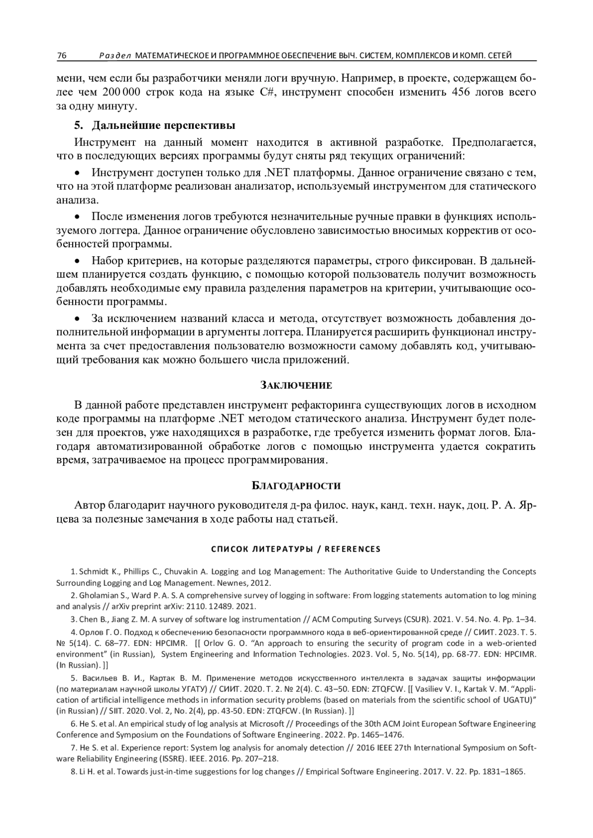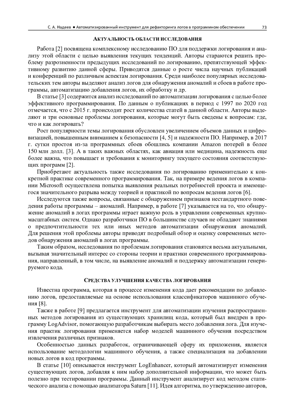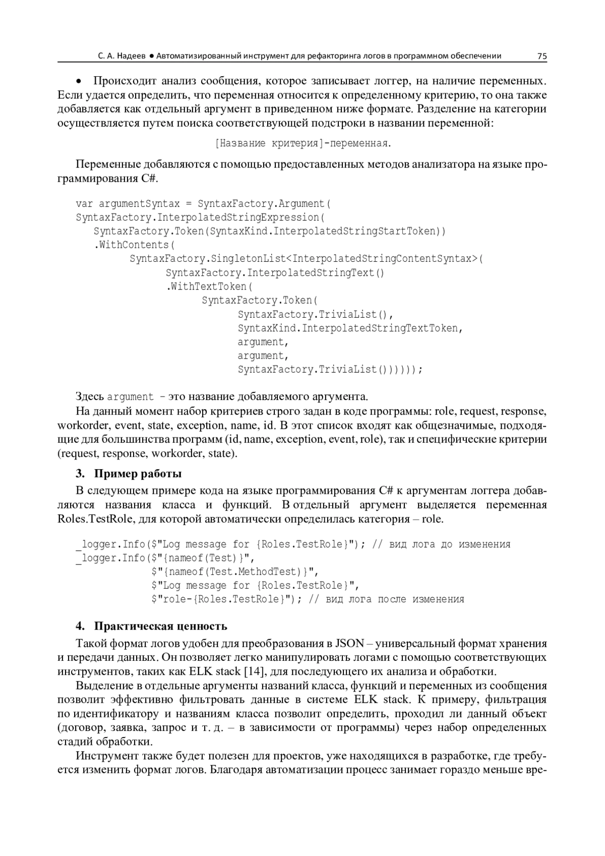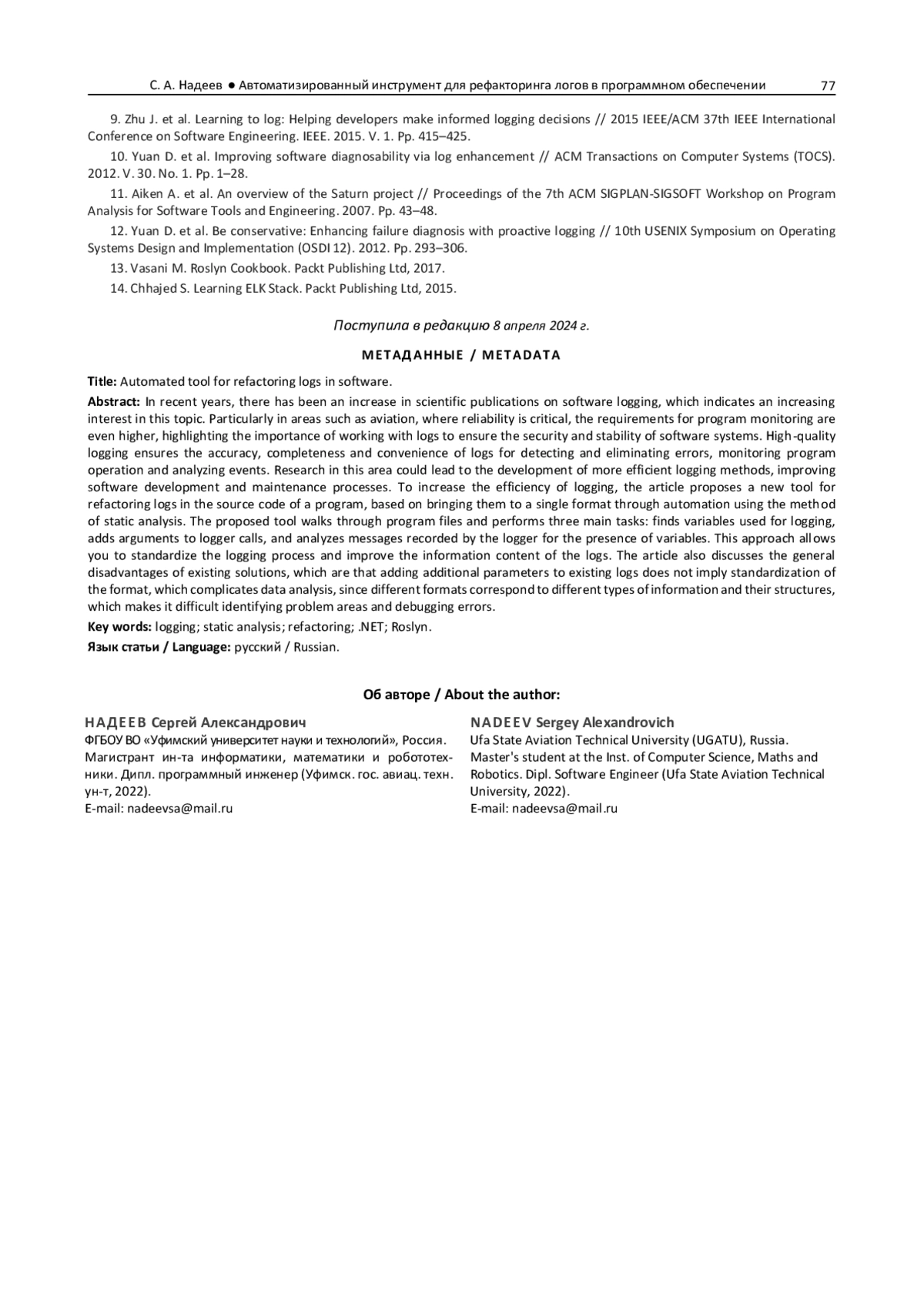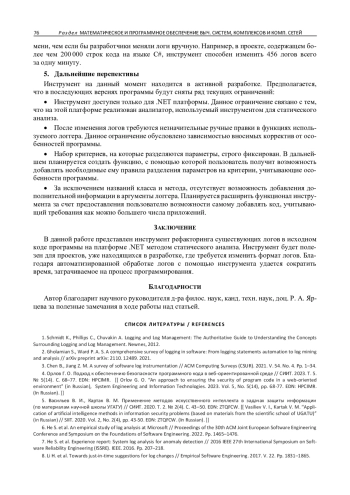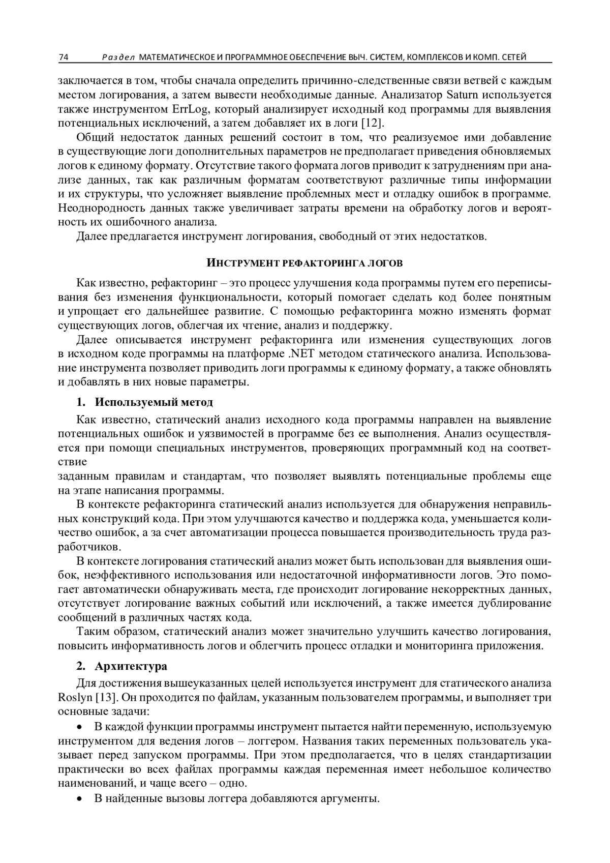В последние годы наблюдается рост научных публикаций по логированию программного обеспечения, что указывает на увеличивающийся интерес к этой теме. В частности, в областях, такие как авиация, где надежность критически важна, требования к мониторингу программ еще выше, что подчеркивает значимость работы с логами для обеспечения безопасности и стабильности программных систем. Качественное логирование обеспечивает точность, полноту и удобство логов для обнаружения и устранения ошибок, мониторинга работы программы и анализа событий. Исследования в этой области могут привести к разработке более эффективных методов логирования, улучшая процессы разработки и обслуживания программного обеспечения. В целях повышения эффективности логирования в статье предлагается новый инструмент для рефакторинга логов в исходном коде программы, основанный на их приведении к единому формату путем автоматизации методом статического анализа. Предлагаемый инструмент проходится по файлам программы и выполняет три основные задачи: находит переменные, используемые для ведения логов, добавляет аргументы в вызовы логгера и анализирует сообщения, записываемые логгером, на наличие переменных. Такой подход позволяет стандартизировать процесс логирования и улучшить информативность логов. Также в статье рассматриваются общие недостатки существующих решений, которые заключаются в том, что добавление дополнительных параметров в существующие логи не предполагает стандартизации формата, что усложняет анализ данных, поскольку различные форматы соответствуют разным типам информации и их структурам, что затрудняет выявление проблемных мест и отладку ошибок.