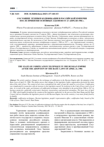 В статье проанализированы изменения в технике кодификационных работ в Российской империи после принятия Основных законов от 23 апреля 1906 г. Автор доказывает, что изменения в организации законодательных органов разрушали основную идею Свода Законов. Содержание новых законов противоречило порядку государственной жизни, изложенному в Своде Законов. Кодификация усложнялась в связи с увеличением законодательного массива. Его включение в Свод Законов занимало много времени. В результате исследования выделены такие особенности техники кодификации в период с 1906 по 1917 г., как охранительный, политический, консервативный характер, противоречивость и практикоориентированность. Основные законы от 23 апреля 1906 г., юридически оформившие создание законодательных органов власти в лице Государственной Думы и Государственного Совета, не упорядочили законодательный процесс в Российской империи, а напротив прочнее закрепили его двойственность.