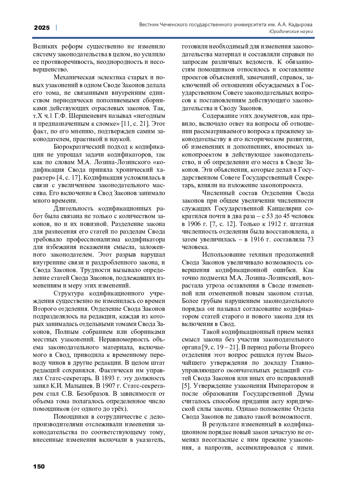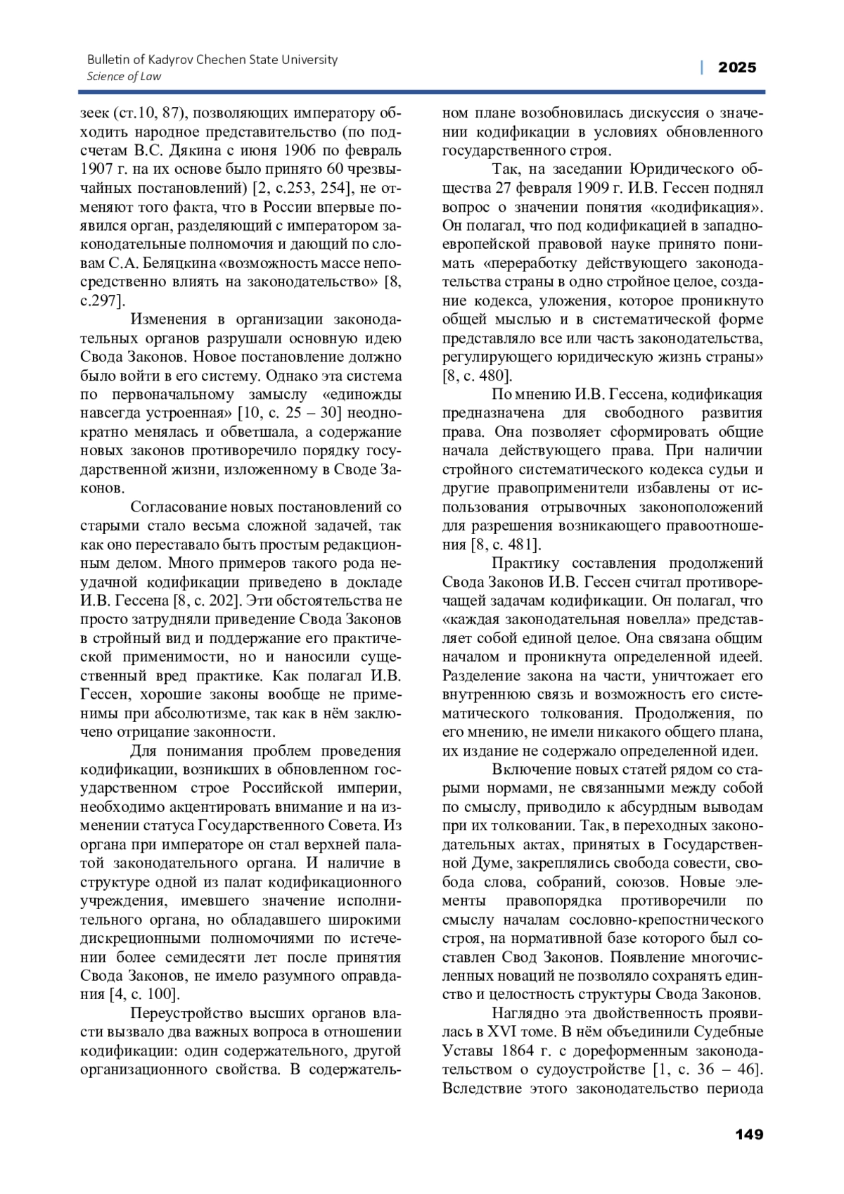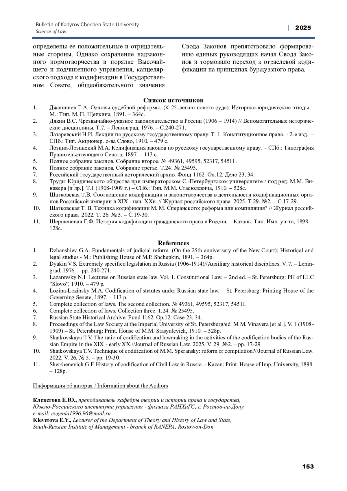 9. Шатковская Т.В. Соотношение кодификации и законотворчества в деятельности кодификационных органов Российской империи в XIX - нач. XXв. // Журнал российского права. 2025. Т.29. №2. - С.17-29. EDN: XZFAEV