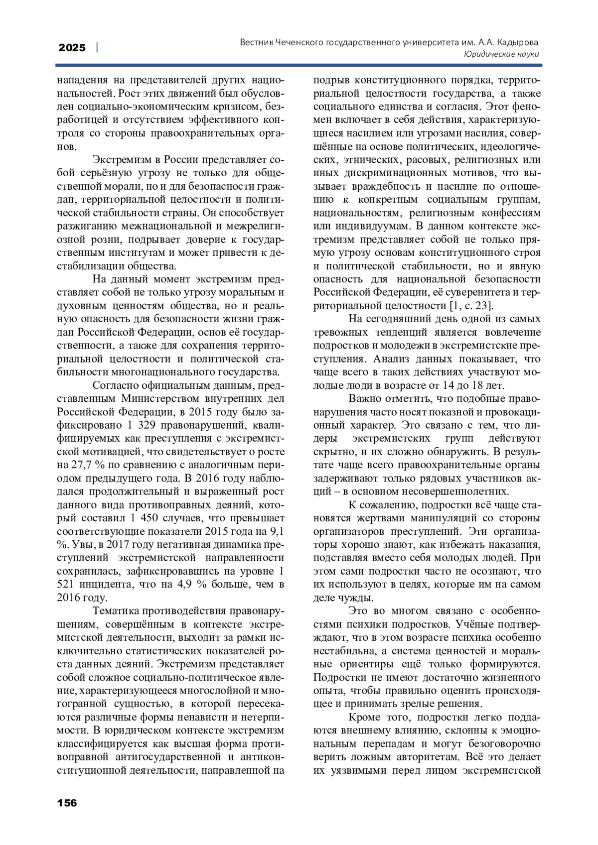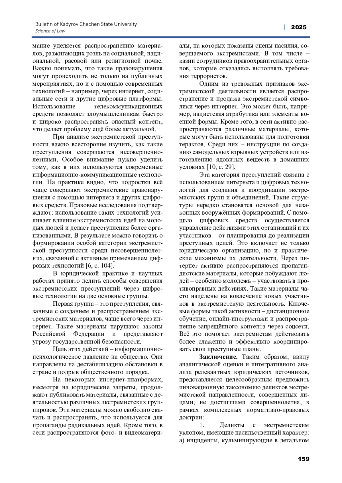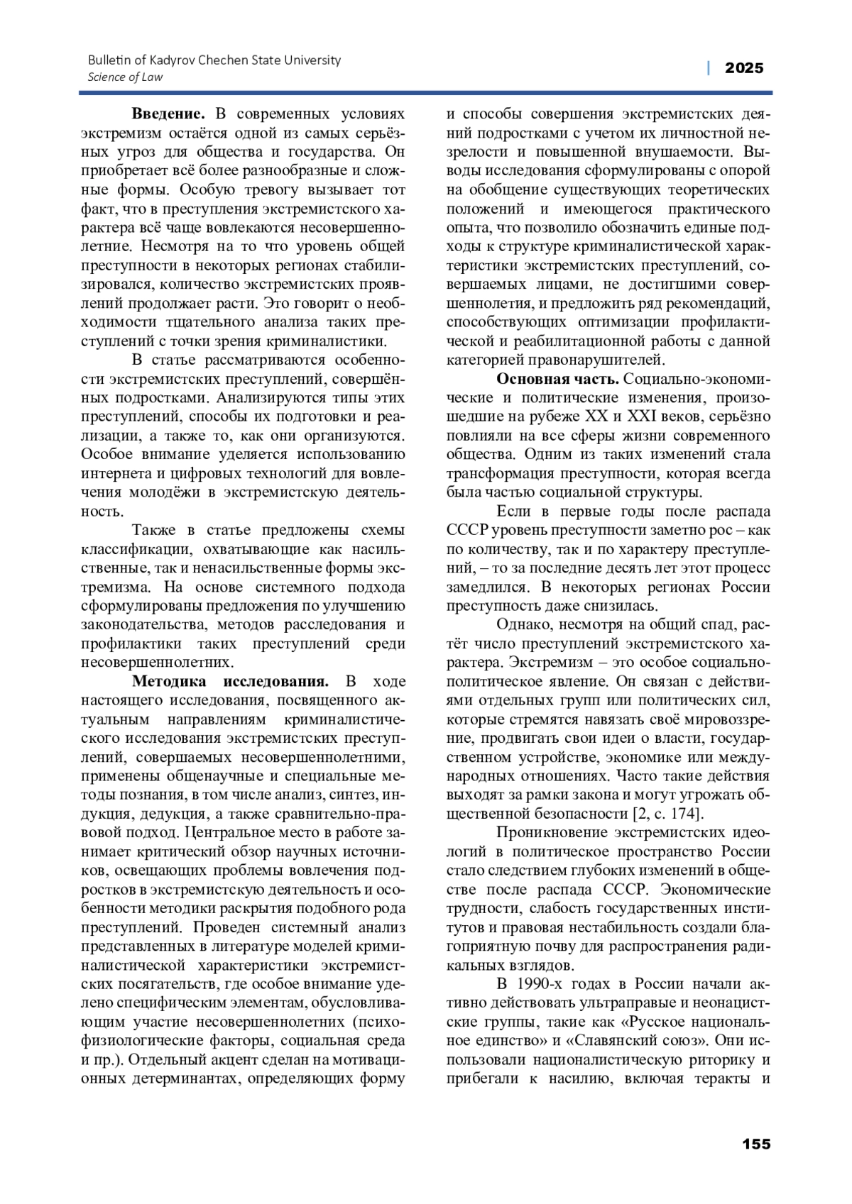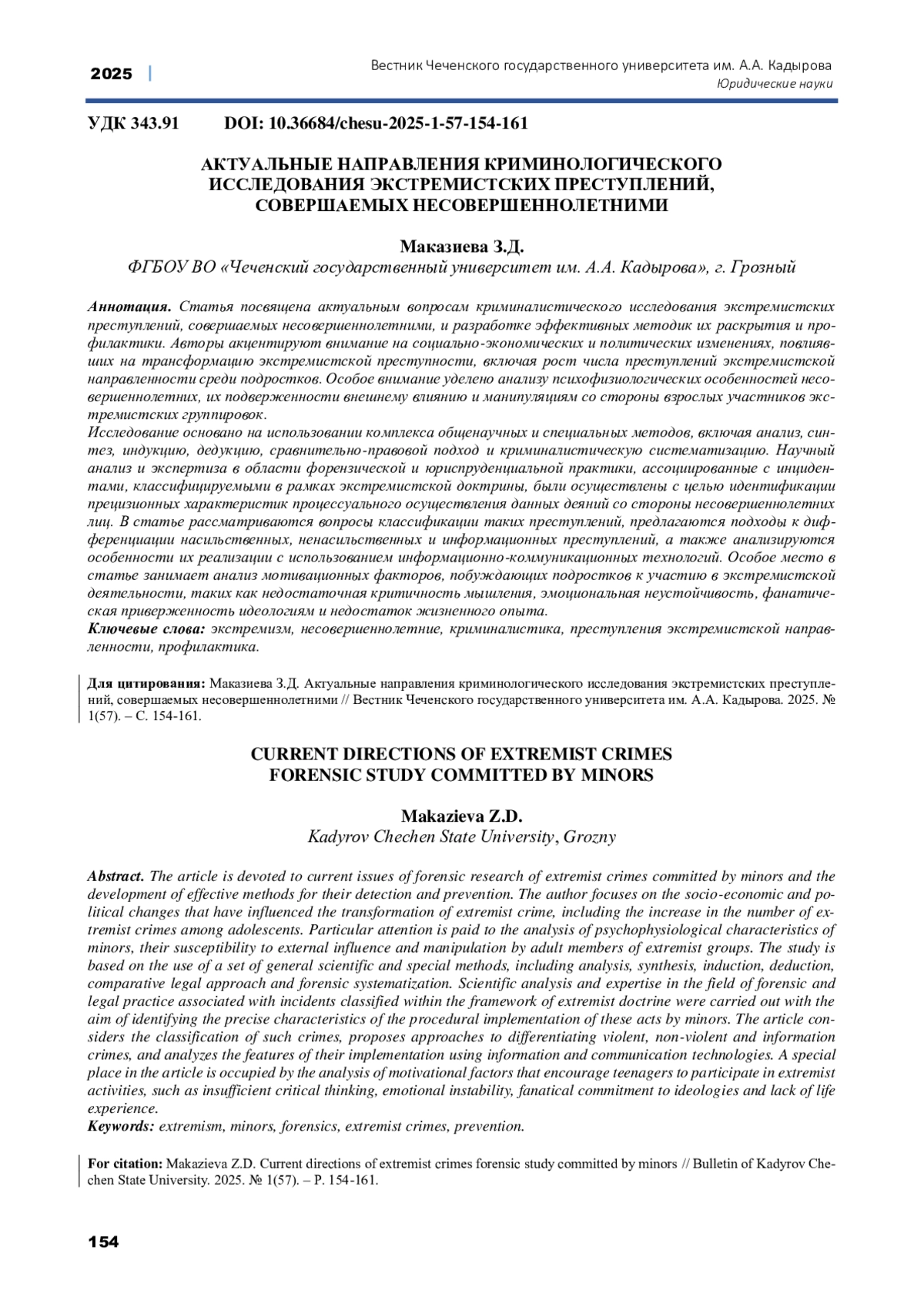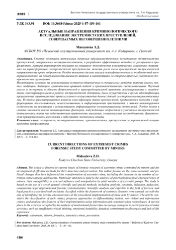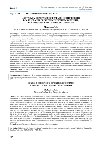 Статья посвящена актуальным вопросам криминалистического исследования экстремистских преступлений, совершаемых несовершеннолетними, и разработке эффективных методик их раскрытия и профилактики. Авторы акцентируют внимание на социально-экономических и политических изменениях, повлиявших на трансформацию экстремистской преступности, включая рост числа преступлений экстремистской направленности среди подростков. Особое внимание уделено анализу психофизиологических особенностей несовершеннолетних, их подверженности внешнему влиянию и манипуляциям со стороны взрослых участников экстремистских группировок. Исследование основано на использовании комплекса общенаучных и специальных методов, включая анализ, синтез, индукцию, дедукцию, сравнительно-правовой подход и криминалистическую систематизацию. Научный анализ и экспертиза в области форензической и юриспруденциальной практики, ассоциированные с инцидентами, классифицируемыми в рамках экстремистской доктрины, были осуществлены с целью идентификации прецизионных характеристик процессуального осуществления данных деяний со стороны несовершеннолетних лиц. В статье рассматриваются вопросы классификации таких преступлений, предлагаются подходы к дифференциации насильственных, ненасильственных и информационных преступлений, а также анализируются особенности их реализации с использованием информационно-коммуникационных технологий. Особое место в статье занимает анализ мотивационных факторов, побуждающих подростков к участию в экстремистской деятельности, таких как недостаточная критичность мышления, эмоциональная неустойчивость, фанатическая приверженность идеологиям и недостаток жизненного опыта.