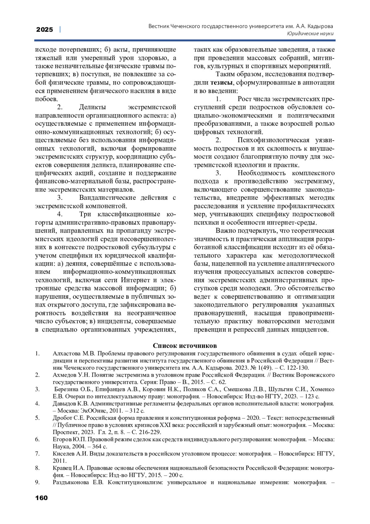 2. Ахмедов У.Н. Понятие экстремизма в уголовном праве Российской Федерации. // Вестник Воронежского государственного университета. Серия: Право - В., 2015. - С. 62.