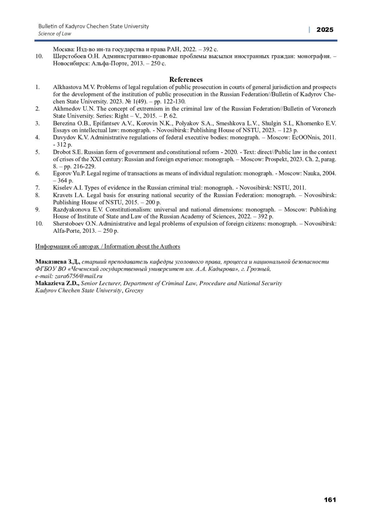 1. Алхастова М.В. Проблемы правового регулирования государственного обвинения в судах общей юрисдикции и перспективы развития института государственного обвинения в Российской Федерации // Вестник Чеченского государственного университета им. А.А. Кадырова. 2023. № 1(49). - С. 122-130. EDN: VHGXDC