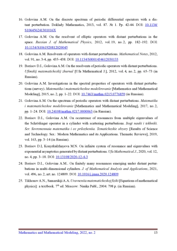 22. Борисов Д.И., Головина А.М. О возникновении резонансов из кратного собственного значения оператора Шрёдингера в цилиндре с разбегающимися возмущениями // Итоги науки и техники. Сер.: Современная математика и ее приложения. Тематические обзоры. 2019. Т. 163. С. 3-14. EDN: DGHLSV