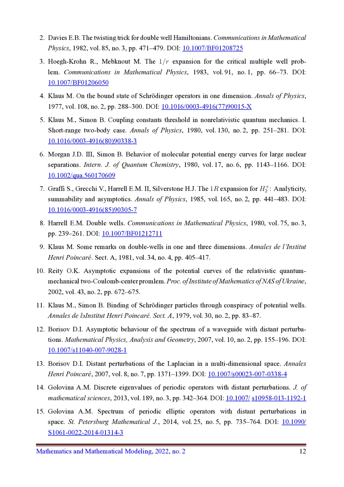 9. Klaus M. Some remarks on double-wells in one and three dimensions // Annales de l’Institut Henri Poincaré. Sect. A. 1981. Vol. 34. No. 4. Pp. 405-417.