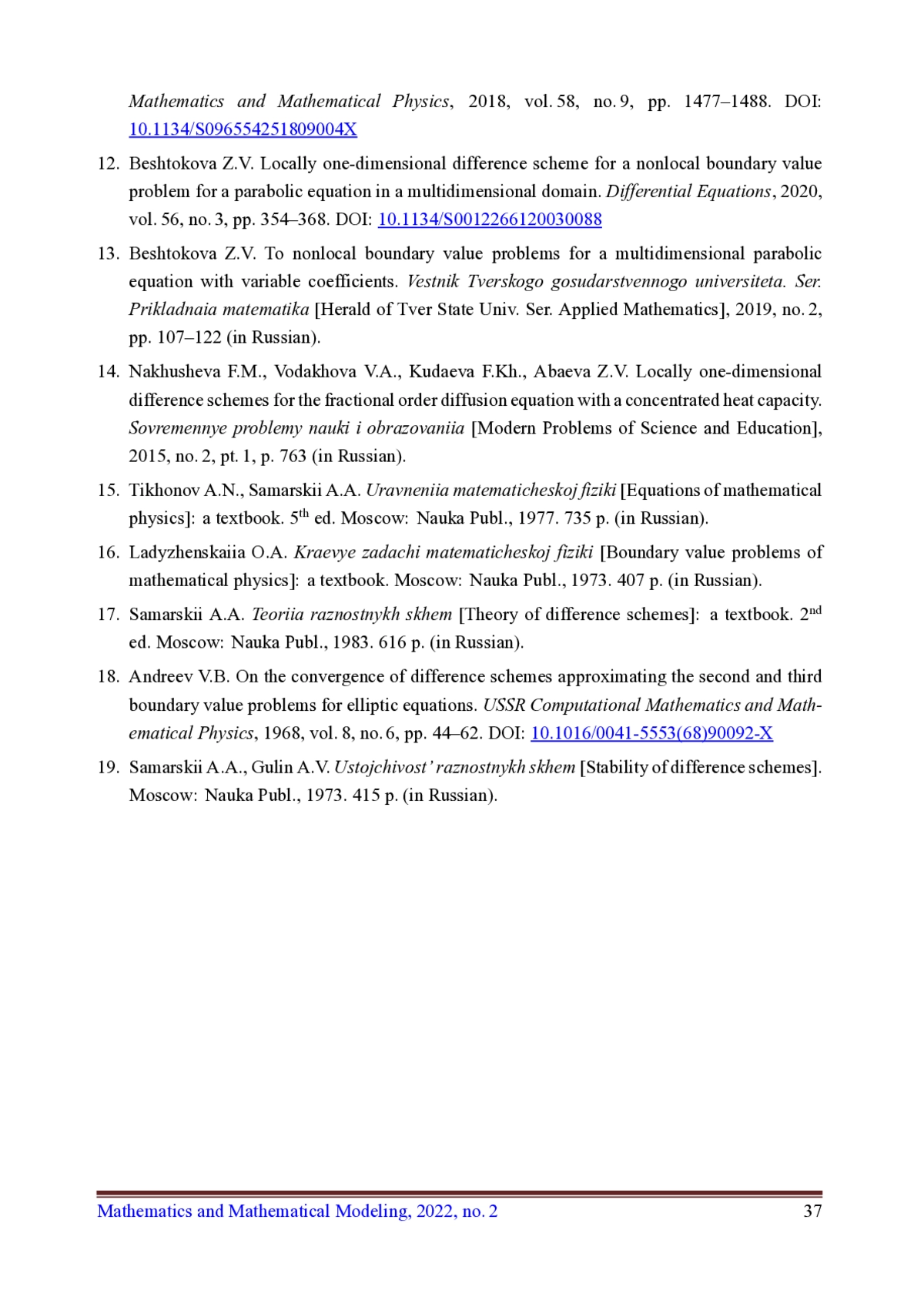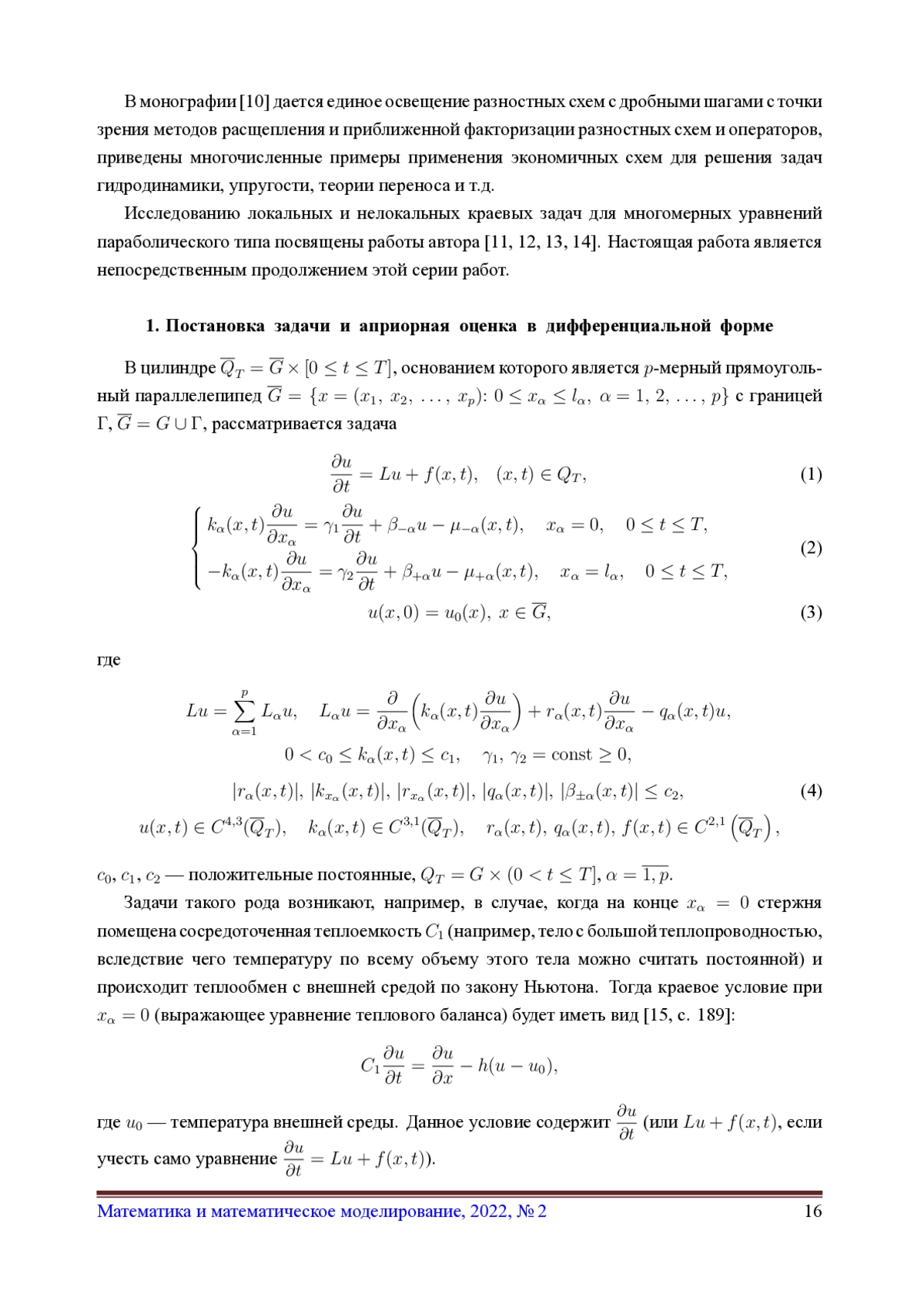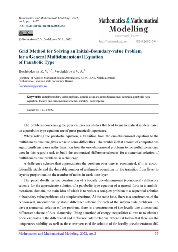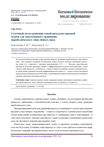 АБАЕВА З. В., ВОДАХОВА В. А. СЕТОЧНЫЙ МЕТОД РЕШЕНИЯ ОДНОЙ НАЧАЛЬНО-КРАЕВОЙ ЗАДАЧИ ДЛЯ МНОГОМЕРНОГО УРАВНЕНИЯ ПАРАБОЛИЧЕСКОГО ТИПА ОБЩЕГО ВИДА // МАТЕМАТИКА И МАТЕМАТИЧЕСКОЕ МОДЕЛИРОВАНИЕ. 2022. 2