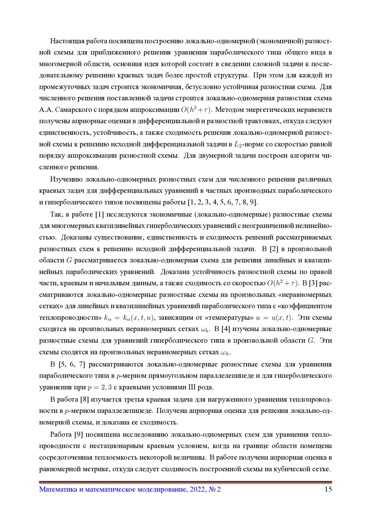 Большое практическое значение имеют задачи, связанные с исследованием физических процессов, приводящих к математическим моделям, в основе которых лежит уравнение параболического типа. При решении параболических уравнений переход от одномерного случая к многомерному вызывает существенные затруднения. Сложность заключается в значительном увеличении объёма вычислений, возникающем при переходе от одномерных задач к многомерным. В этой связи актуальное значение приобретает задача построения экономичных разностных схем для численного решения многомерных задач. Разностную схему, аппроксимирующую задачу со временем, называют экономичной, если она безусловно устойчива и при переходе от слоя к слою требуется количество арифметических операций, пропорциональное числу узлов на каждом временном слое. Настоящая работа посвящена построению локально-одномерной (экономичной) разностной схемы для приближенного решения уравнения параболического типа общего вида в многомерной области, основная идея которой состоит в сведении сложной задачи к последовательному решению краевых задач более простой структуры. При этом для каждой из промежуточных задач строится экономичная, безусловно устойчивая разностная схема. Для численного решения поставленной задачи строится локально-одномерная разностная схема А. А. Самарского. Методом энергетических неравенств получены априорные оценки в дифференциальной и разностной трактовках, откуда следуют единственность, устойчивость, а также сходимость решения локально-одномерной разностной схемы к решению исходной дифференциальной задачи. Для двумерной задачи построен алгоритм численного решения.