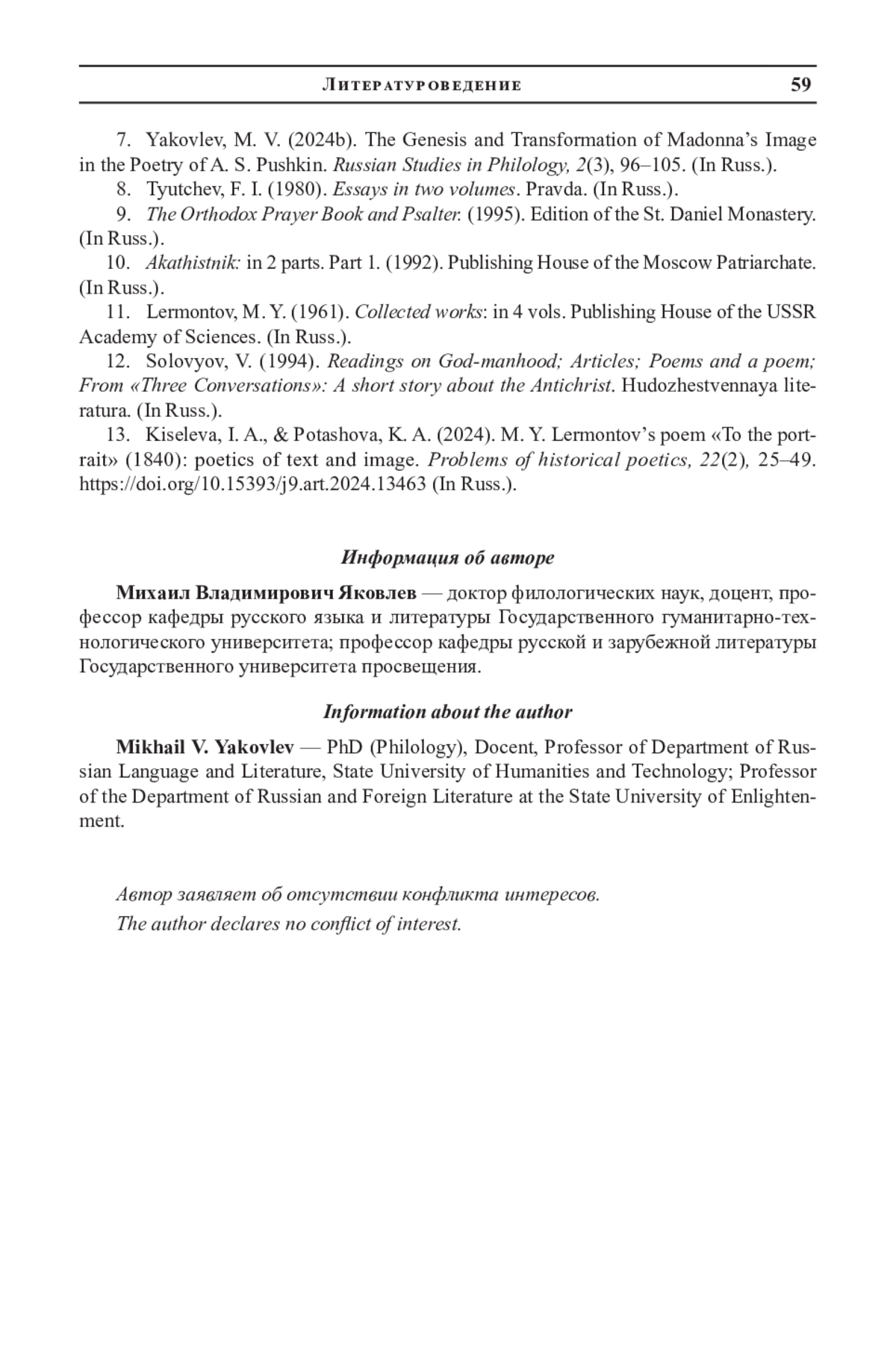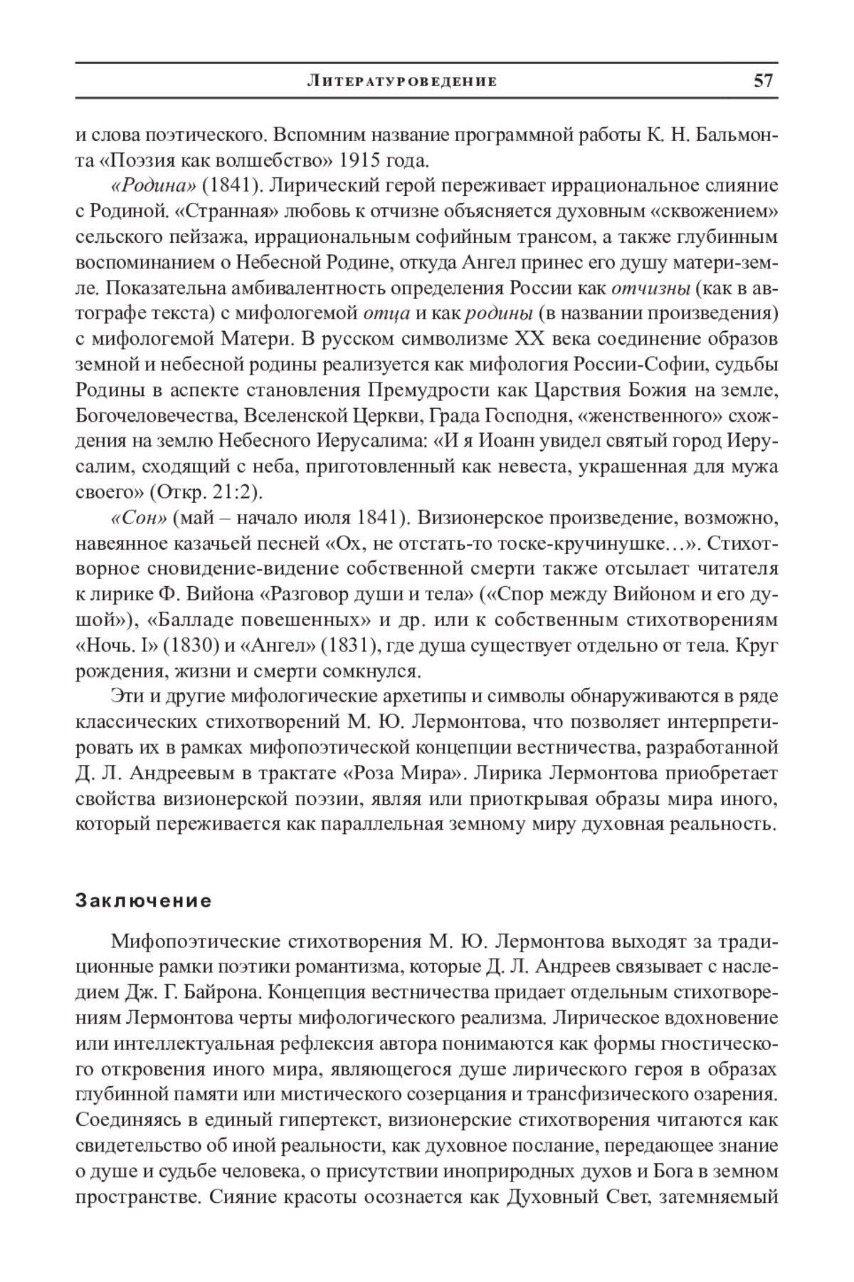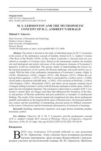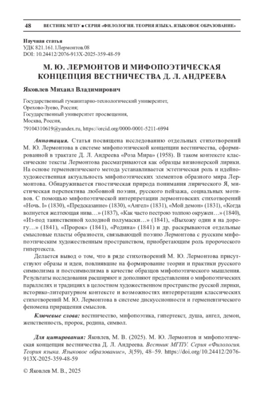 ЯКОВЛЕВ М. В. М. Ю. ЛЕРМОНТОВ И МИФОПОЭТИЧЕСКАЯ КОНЦЕПЦИЯ ВЕСТНИЧЕСТВА Д. Л. АНДРЕЕВА // ВЕСТНИК МГПУ. СЕРИЯ: ФИЛОЛОГИЯ. ТЕОРИЯ ЯЗЫКА. ЯЗЫКОВОЕ ОБРАЗОВАНИЕ. 2025. № 3 (59)